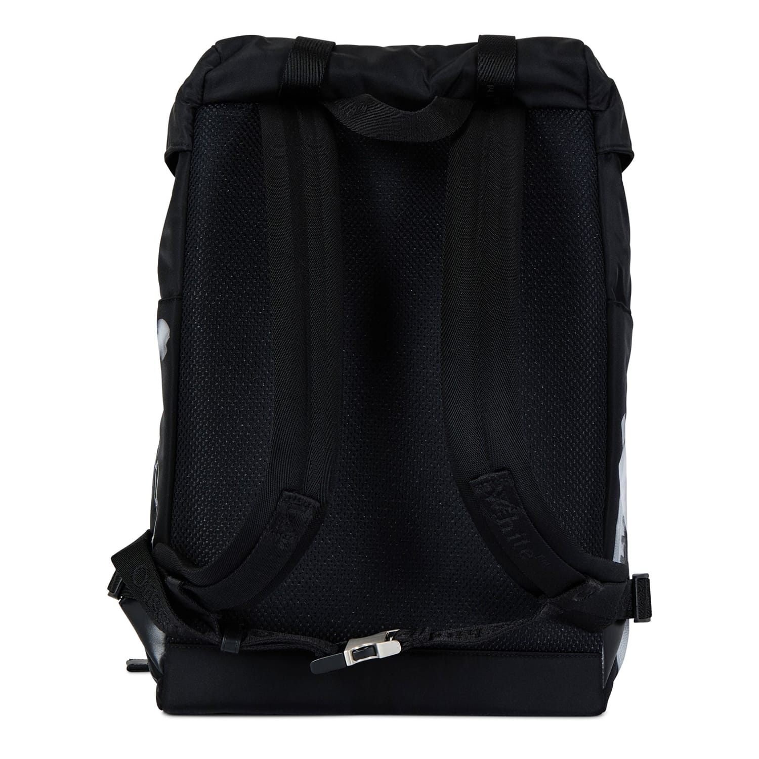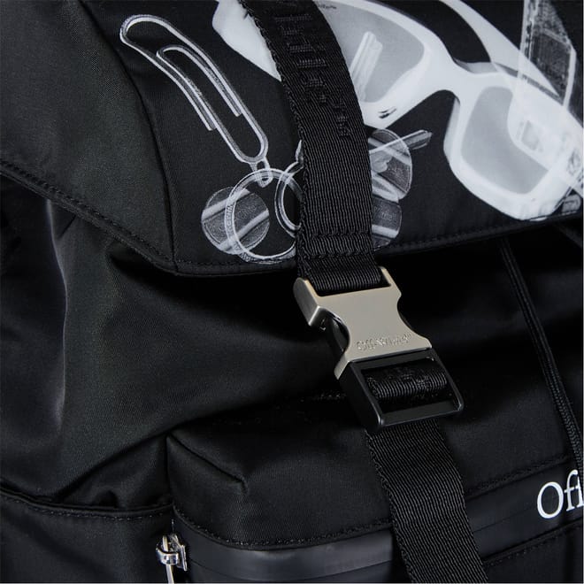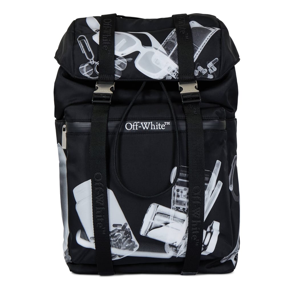 Discover the Off White backpack, featuring a striking graphic print and a prominent logo embellishment. This stylish accessory is designed with a secure buckle and zipper closure, ensuring your belongings are safe. The top handle adds convenience, making it an ideal choice for those on the go. -