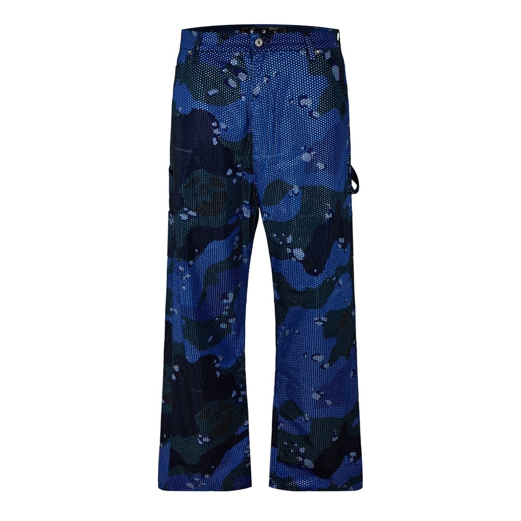Off White cargo pants feature a camo pattern, offering a stylish and functional design. These pants come with a zip fly and button closure, ensuring a secure fit. The inclusion of pockets and side pockets adds practicality, making them ideal for those who value both fashion and utility. -