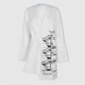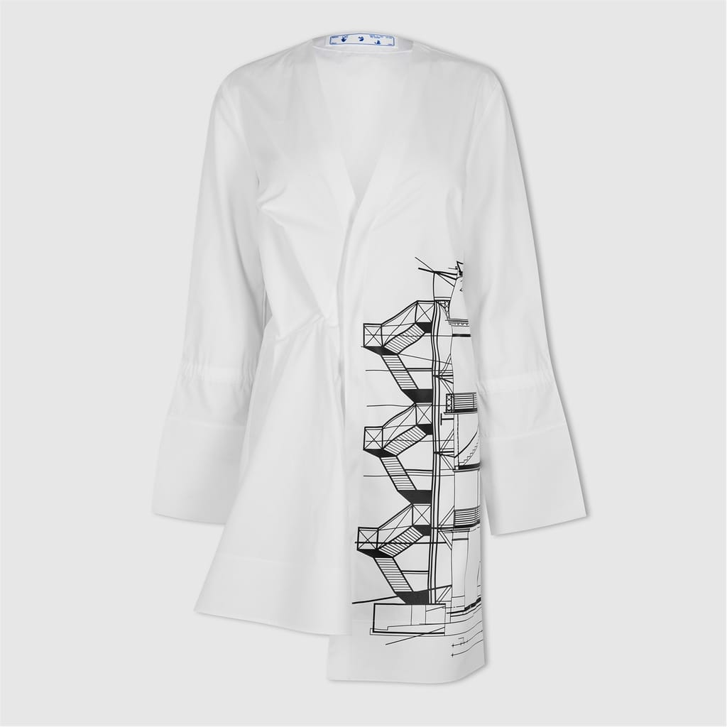 This Off White mini wrap dress features a striking graphic print, adding a bold touch to your wardrobe. The dress is designed with a v-neck and long sleeves, offering a regular fit for comfortable wear. Its asymmetrical hemline enhances the modern aesthetic, making it a standout piece for any occasion. -