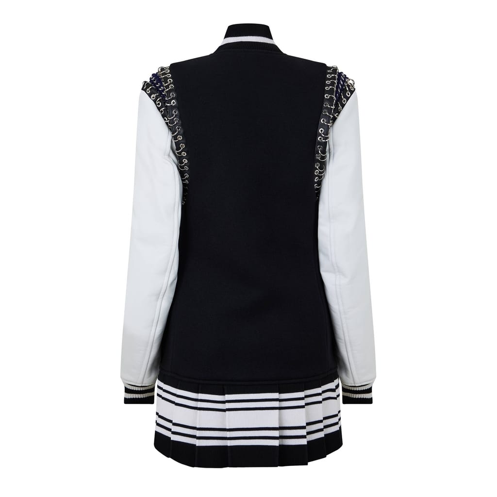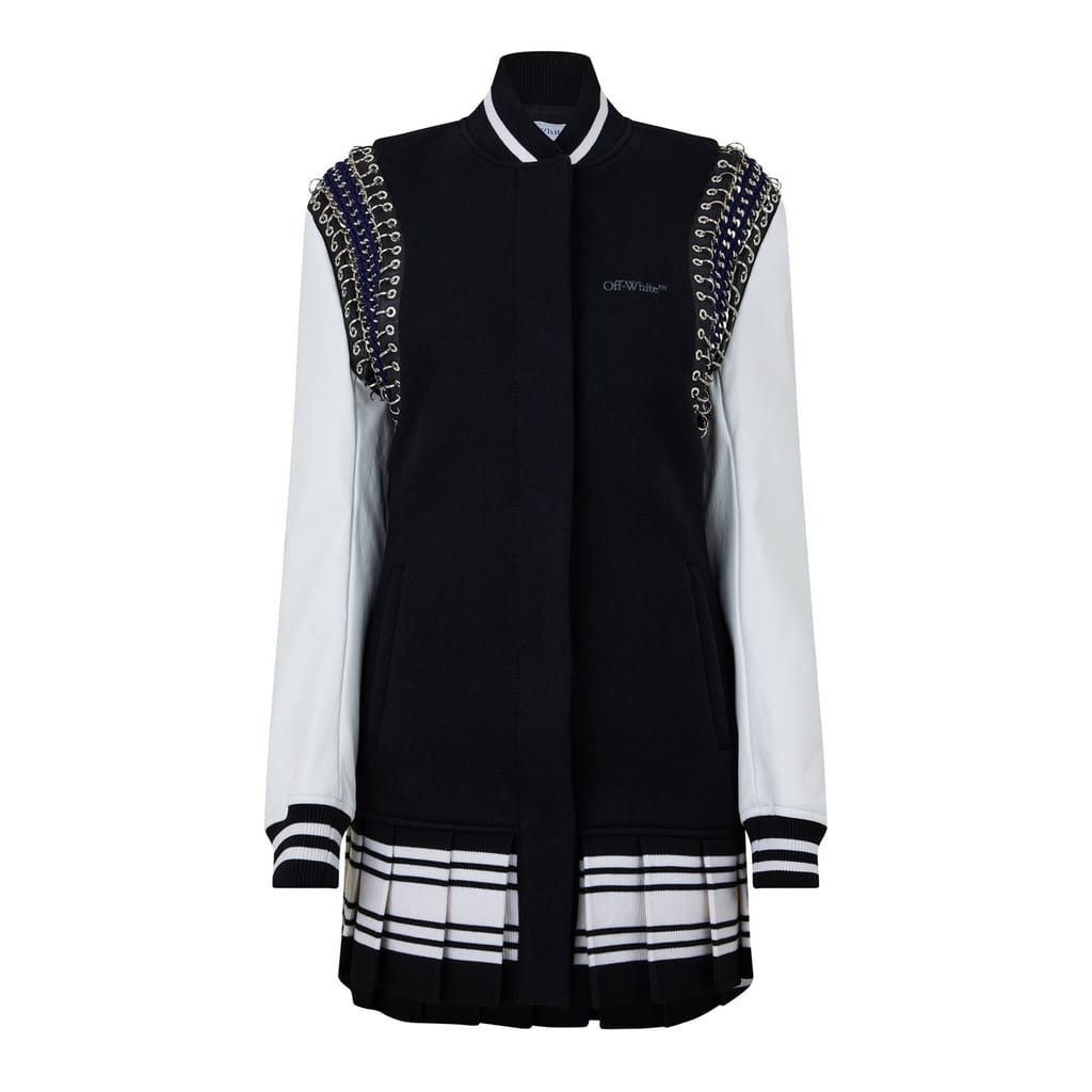 Off White mini dress features a bomber collar and long sleeves, offering a unique t-shirt style. The dress is adorned with chain embellishments and striking stripe patterns, complemented by lettering graphics. Its straight hemline adds a clean finish to this distinctive piece. -