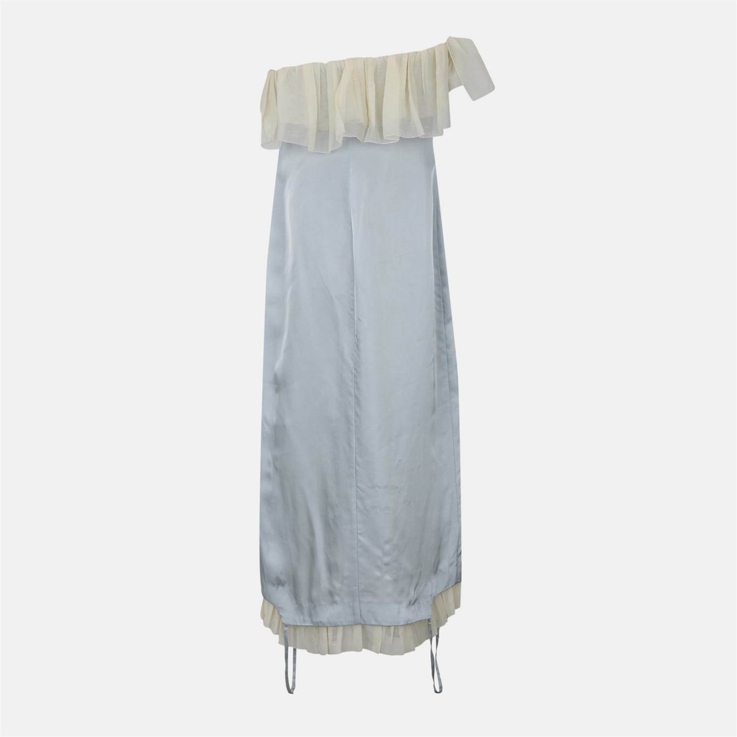 This Off White maxi dress is a stunning bodycon piece, featuring a one-shoulder neckline and a slim fit. The solid pattern is elegantly complemented by ruffle embellishments, including a ruffle hem, adding a touch of sophistication. Perfect for making a statement, this dress combines style and elegance effortlessly. -