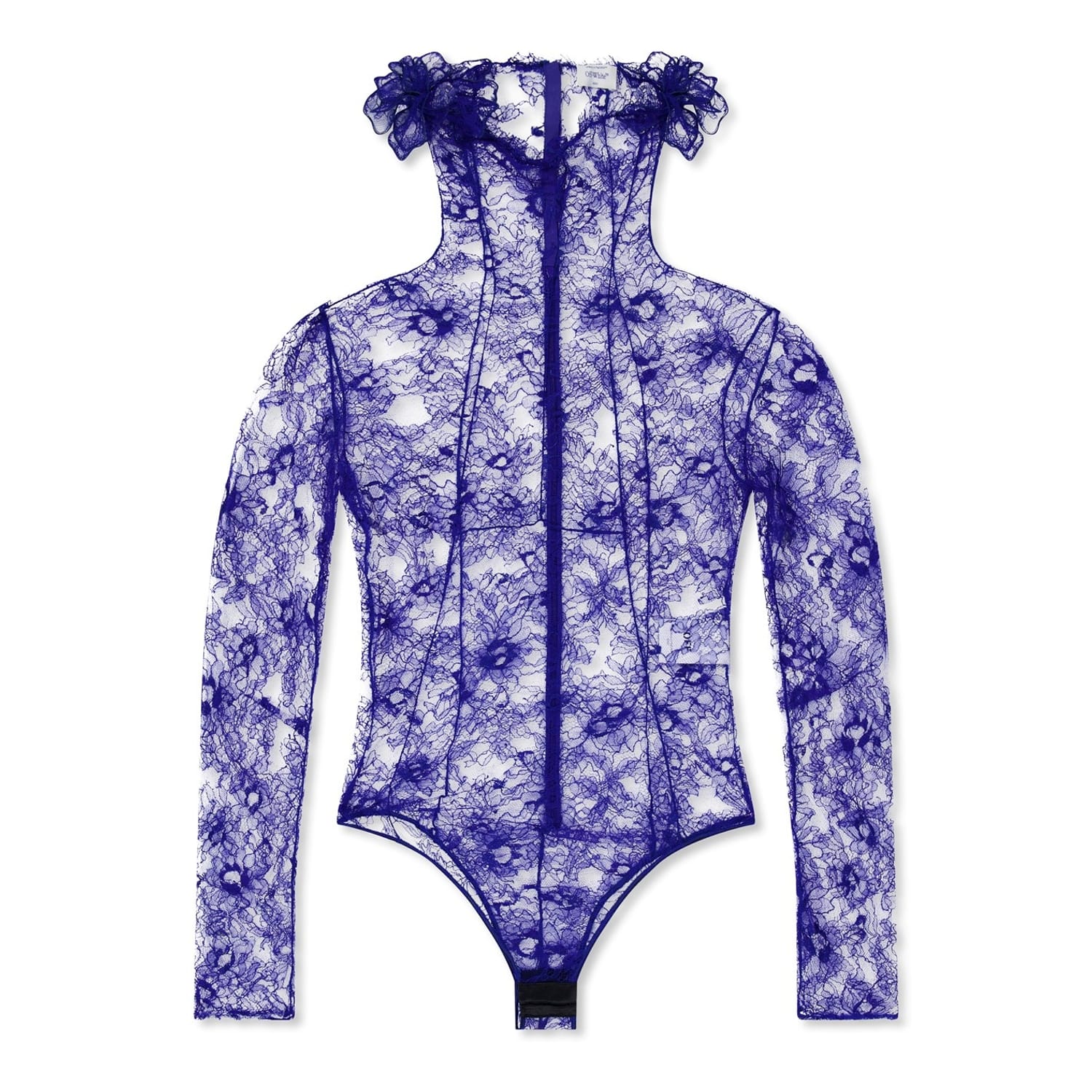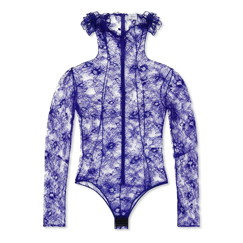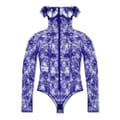 This Off White top features a high neck and a zipper closure, offering a slim fit. The floral pattern adds a touch of elegance, while the ruffle embellishments provide a stylish flair. -