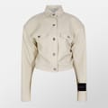 This Off-White suit jacket features a relaxed fit with a shirt collar and a straight hem. The solid pattern and short length offer a contemporary look. It includes a button closure and is embellished with a logo and pockets, adding a touch of practicality and style. -