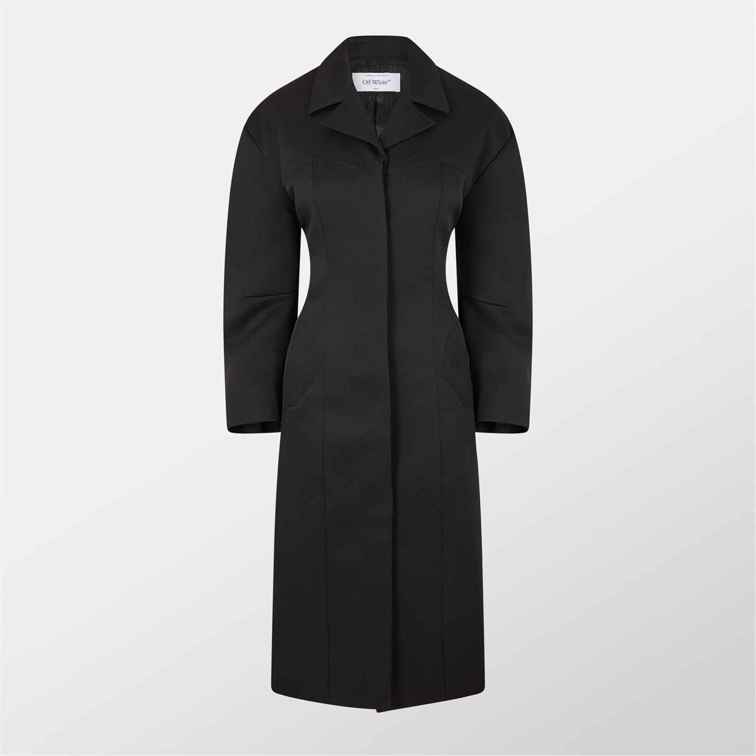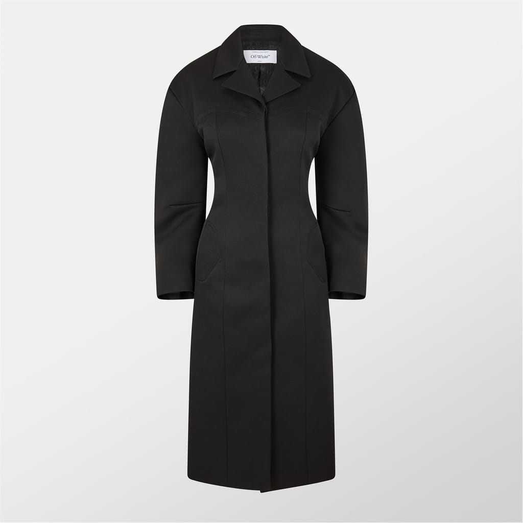 The Off-White overcoat is a winter essential, featuring a lapel collar and a straight hem. Designed with a regular fit, it offers a solid pattern and includes practical pockets. The button closure adds a classic touch, making it a versatile choice for formal occasions. -