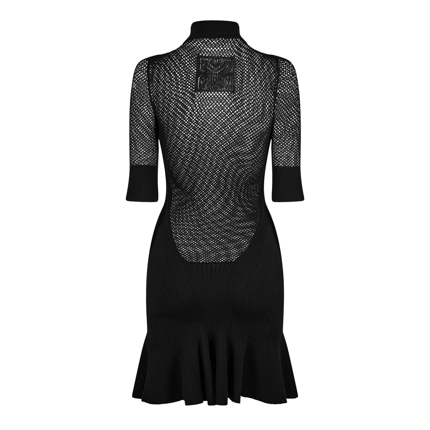 This Off White mini dress features a ribbed knit design, offering a slim fit that accentuates the silhouette. The dress is styled with a polo collar and a collared neck, complemented by three-quarter sleeves. The ruffle hem adds a touch of elegance, making it a versatile choice for various occasions. -