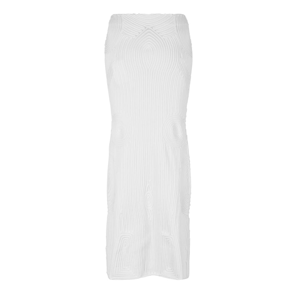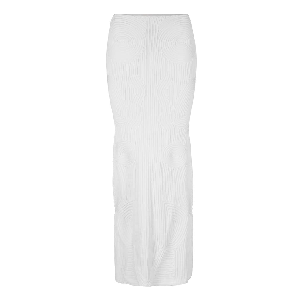 Discover the Off White midi skirt, a perfect blend of casual elegance and modern style. This knit piece features a textured pattern and a slim fit, offering a flattering silhouette. The A-line design adds a touch of sophistication, making it a versatile addition to any wardrobe. -
