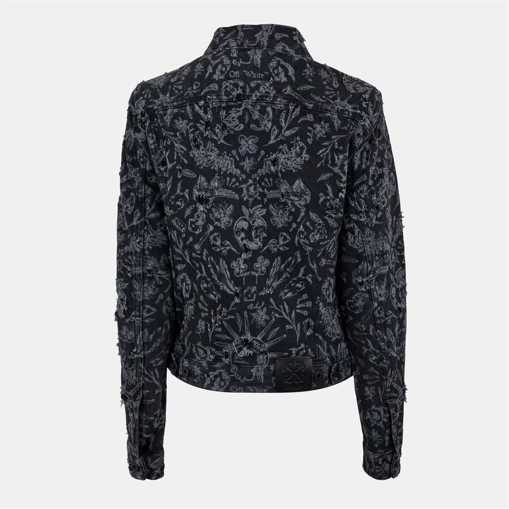 This Off-White denim jacket features a shirt collar and a button closure, offering a regular fit. The short length and straight hem provide a classic silhouette. Adorned with a floral pattern and a distinctive logo embellishment, this jacket combines style and brand identity seamlessly. -