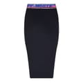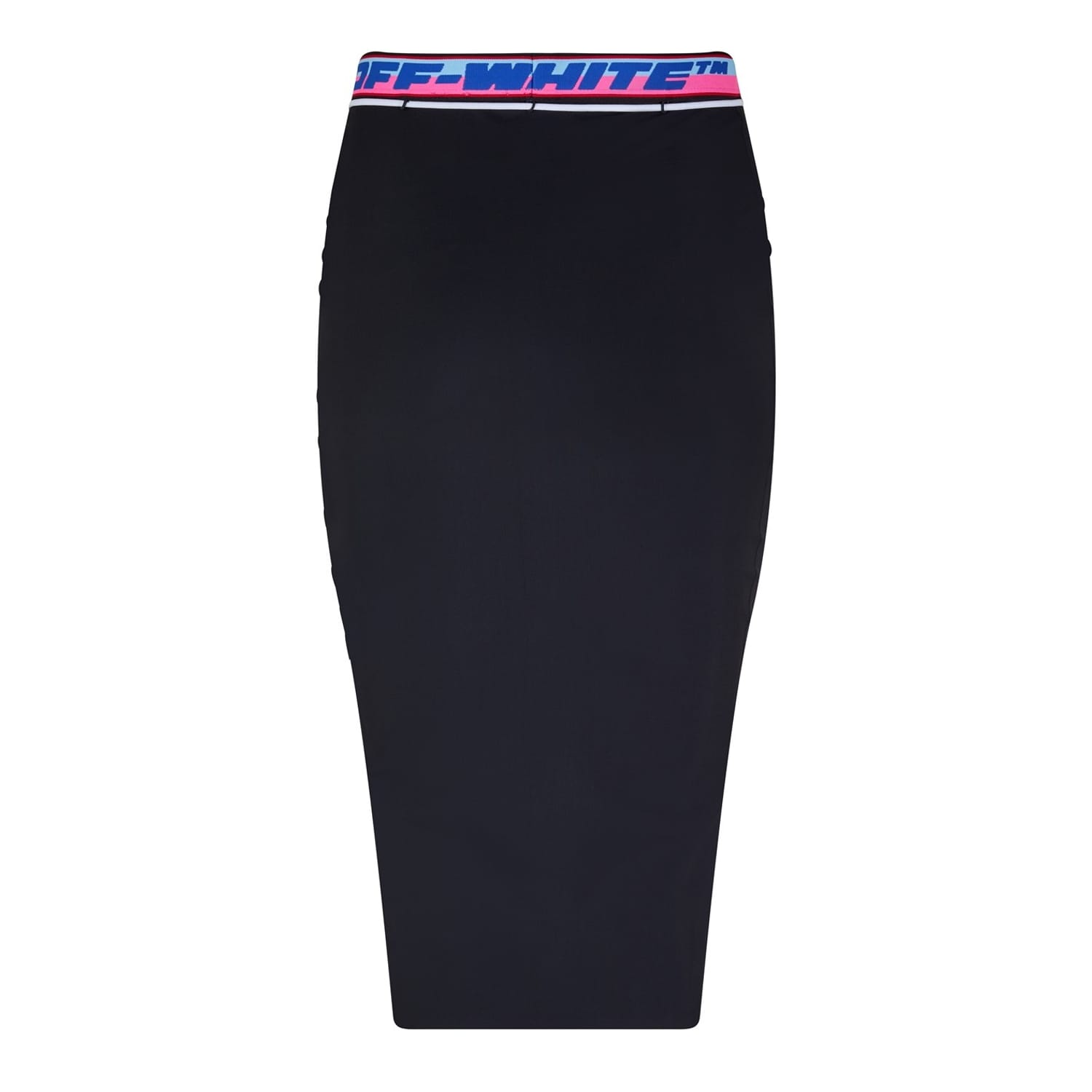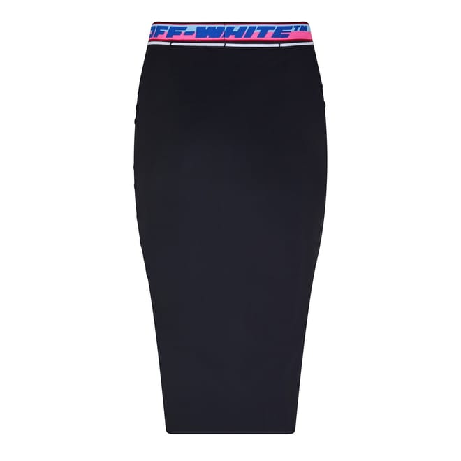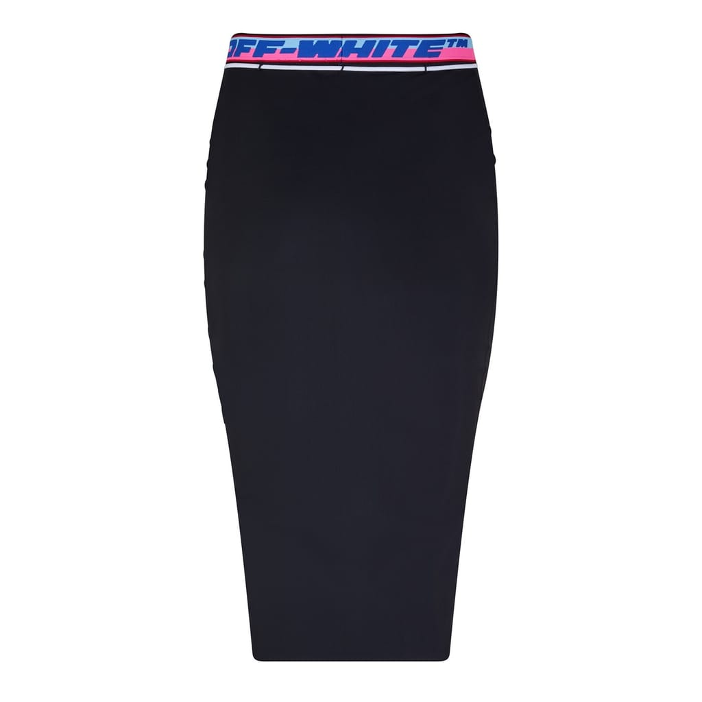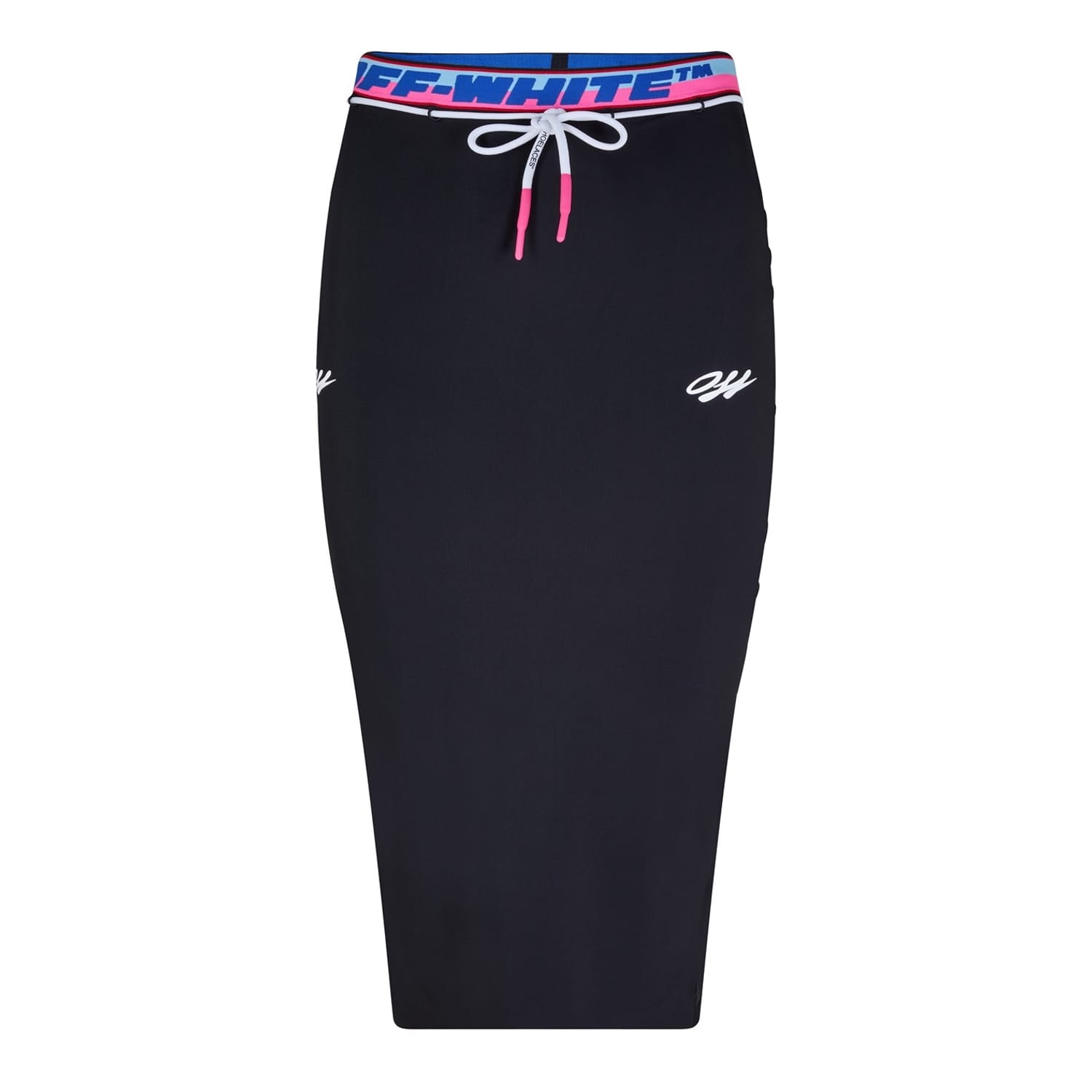 This Off-White midi pencil skirt is a perfect blend of casual and activewear styles. Featuring a slim fit and a convenient drawstring closure, it offers both comfort and style. The skirt is adorned with a subtle logo embellishment, adding a touch of brand identity to your ensemble. -