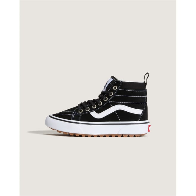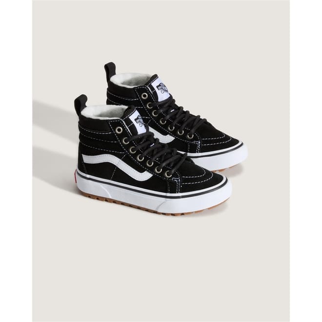 These Vans skate shoes are perfect for children who love a stylish and functional footwear option. Featuring a hi-top design, these canvas shoes offer excellent ankle support. The round toe adds comfort, making them ideal for active kids. With their iconic style, these shoes are a great choice for young skate enthusiasts. -