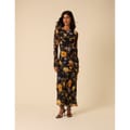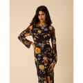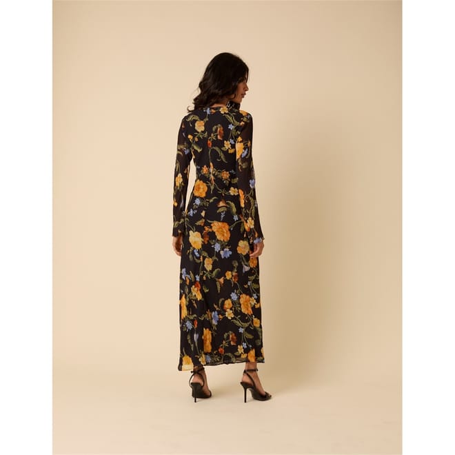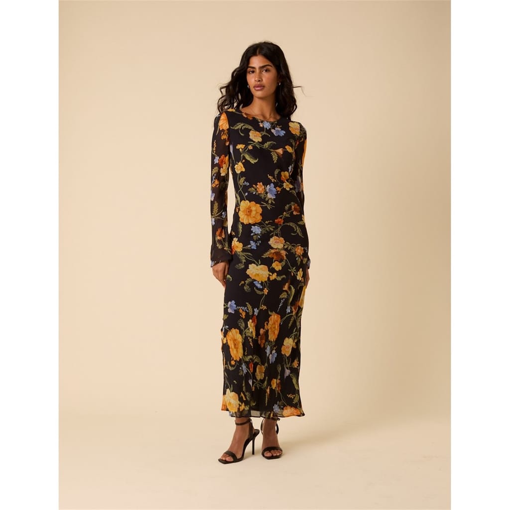 Head-turning style. Coming in black, this midi dress features tapestry florals designed in-house. The slim-fit silhouette falls to a bias cut for an effortless, fluid look.