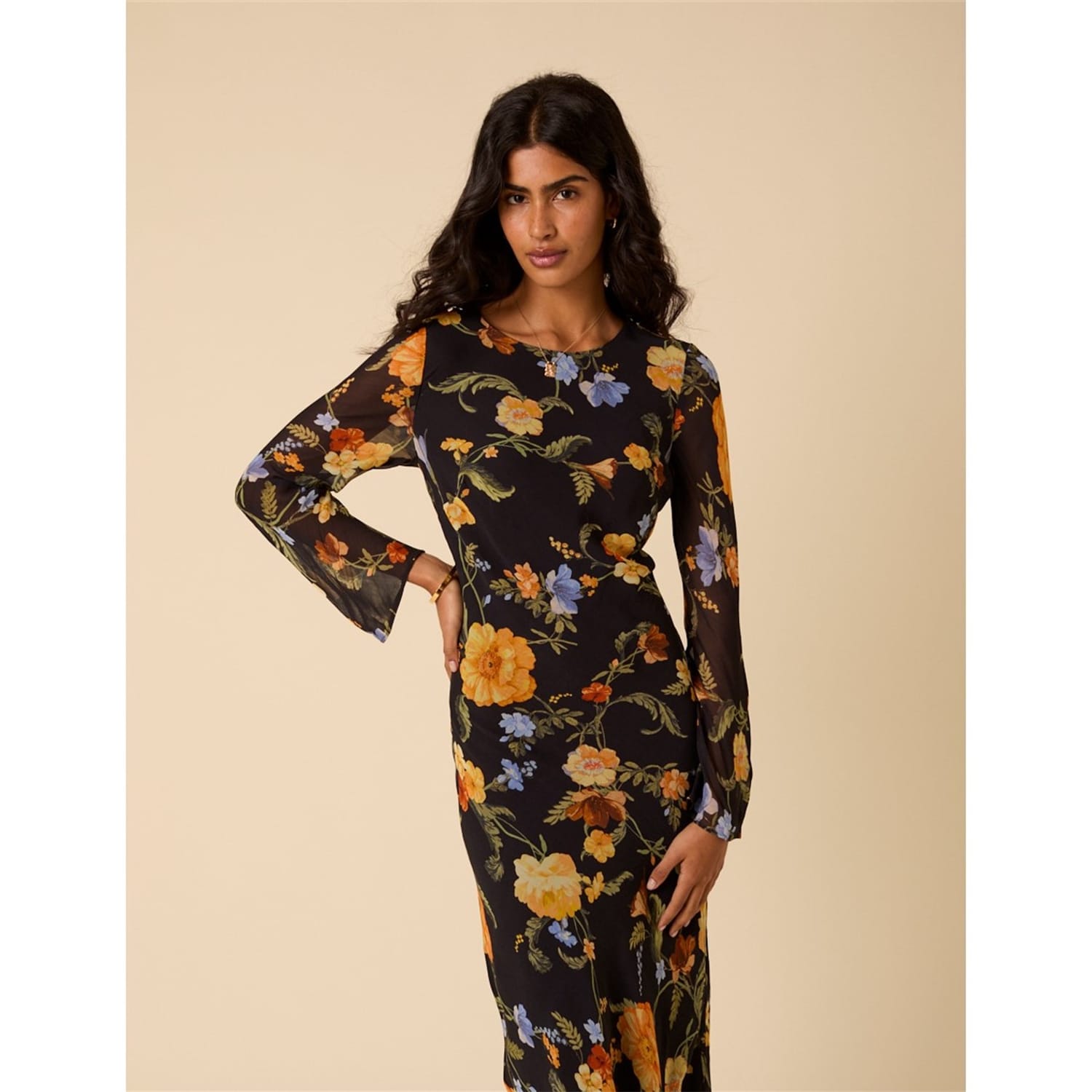 - • Long fluted sleeves