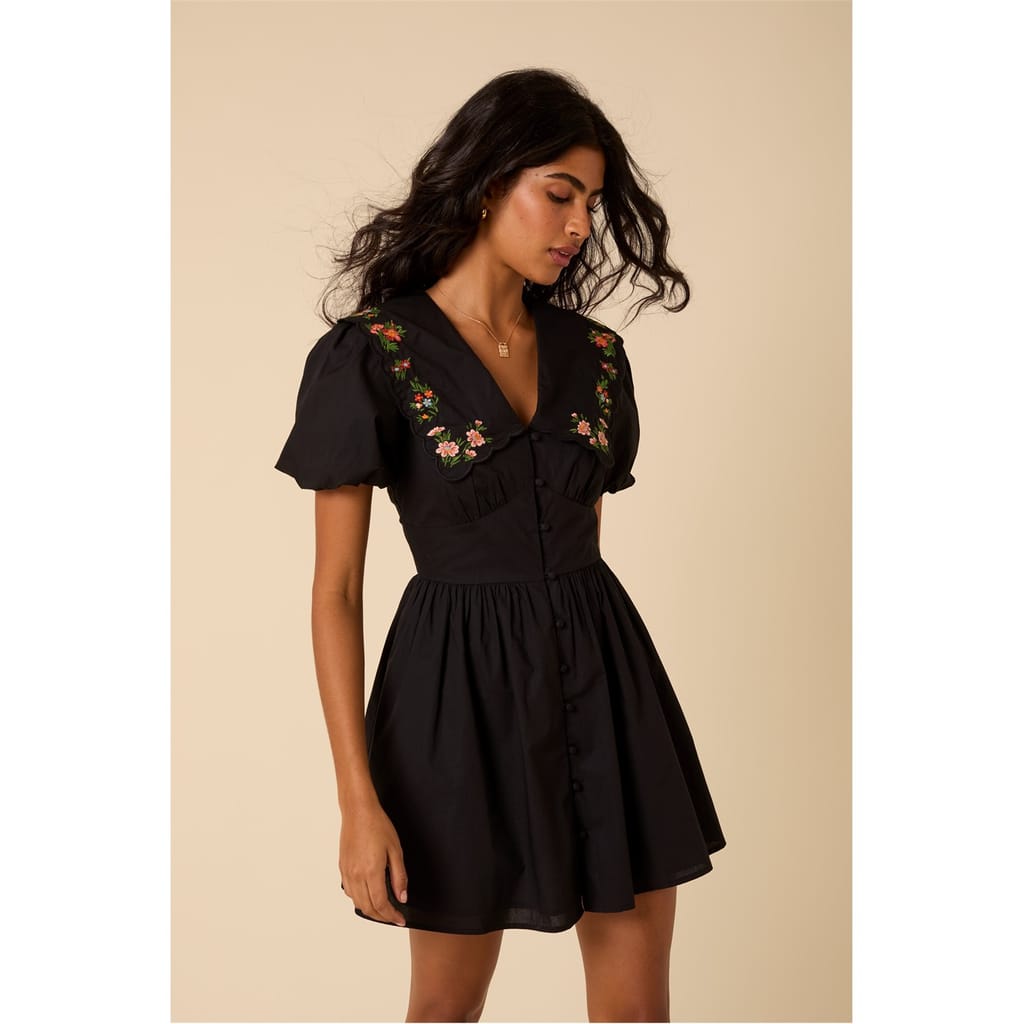 Birdie's back, now as a black mini dress. Embroidered with delicate florals, her statement collar steals the spotlight. We love the short puff sleeves and swishy skirt too.