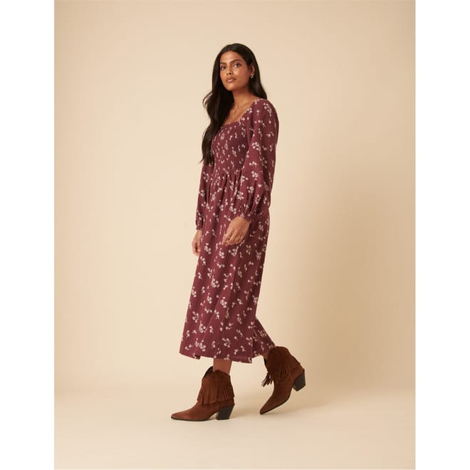 Meet your new favourite midi. Coming in dusty maroon with pretty all-over florals, our midi dress features a square neck, complete with a shirred bodice for comfort.