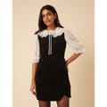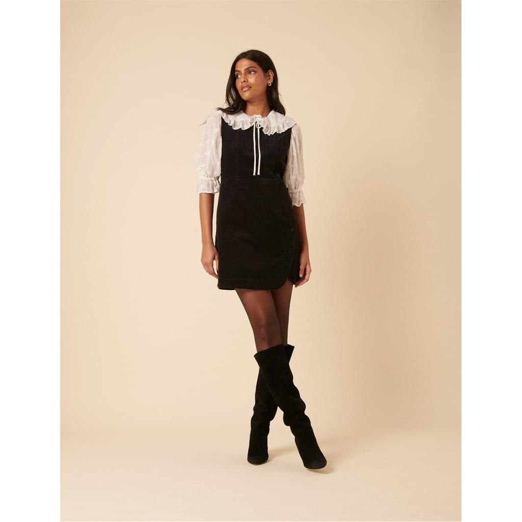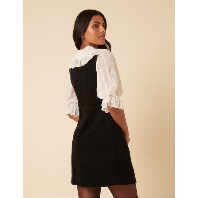 One and done. Coming in classic black, this soft cord pinafore mini dress features a round neck and an easy A-line shape. Its side button detailing adds subtle asymmetrical detailing.