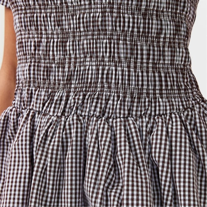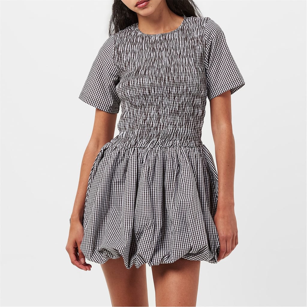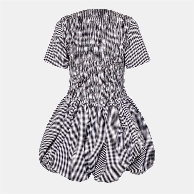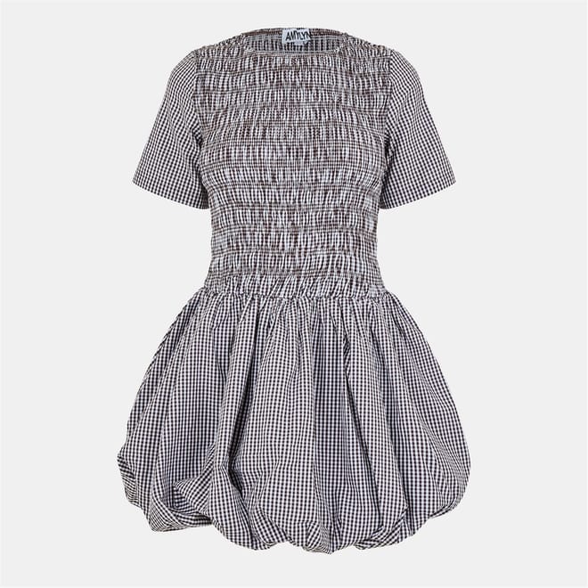 This Amylynn mini dress features a charming gingham pattern, perfect for a stylish look. The crew neck and short sleeves offer a classic touch, while the bubble hem adds a playful element. Ideal for those seeking a blend of elegance and fun in their wardrobe. -