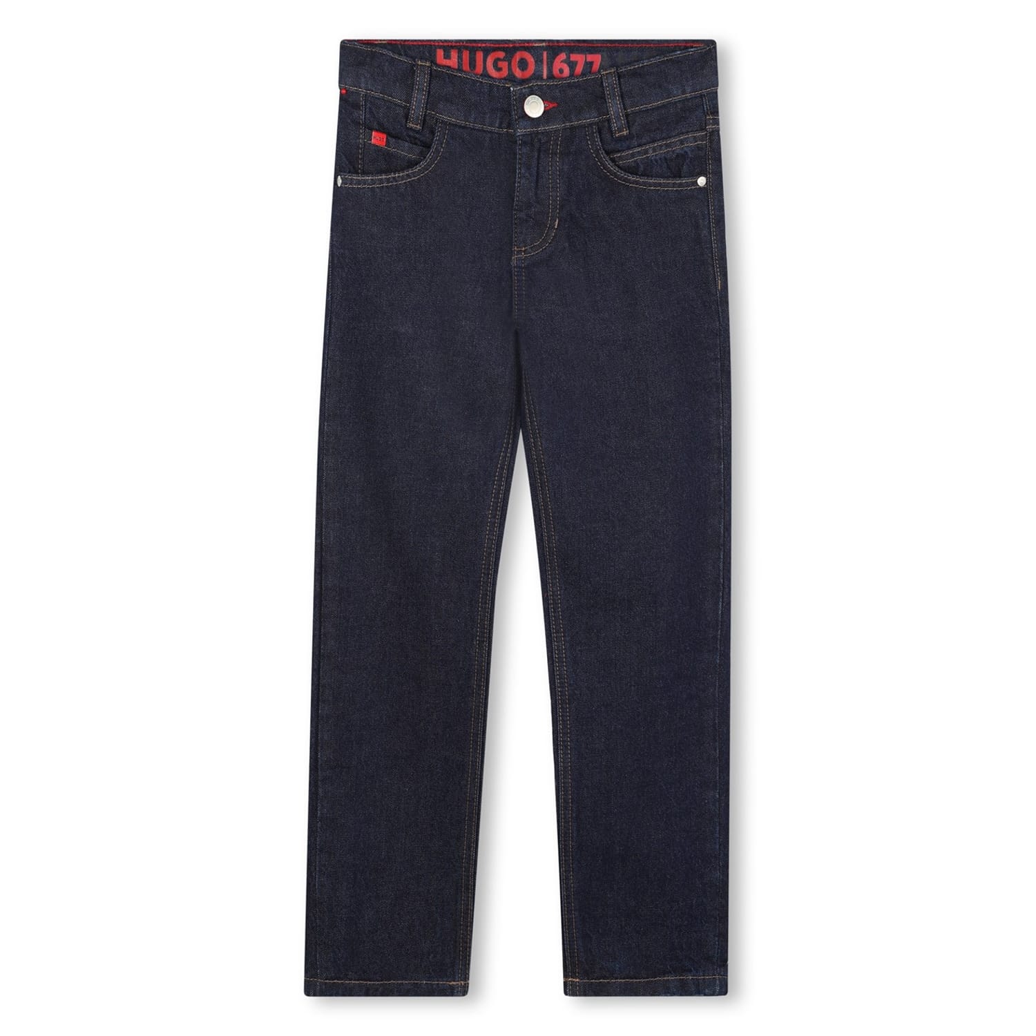 Discover the Hugo five-pocket design jeans, featuring a classic button and zip fly closure. These regular fit jeans are adorned with a subtle logo embellishment, offering a timeless and versatile addition to your wardrobe. -