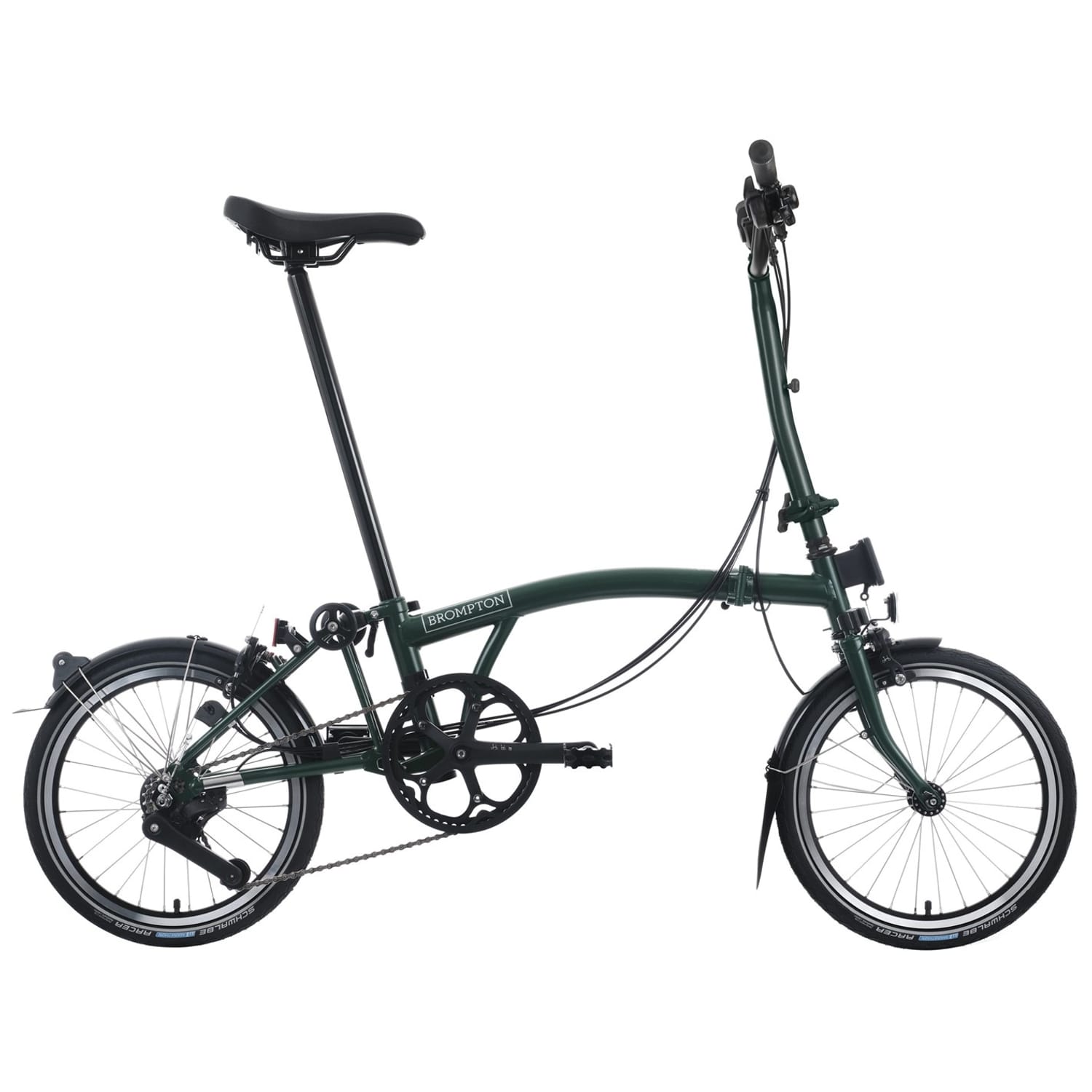 - Saddle: Brompton saddle with integrated carry handle (147mm). Incorporates a mount for a Brompton rear light and saddle bag.