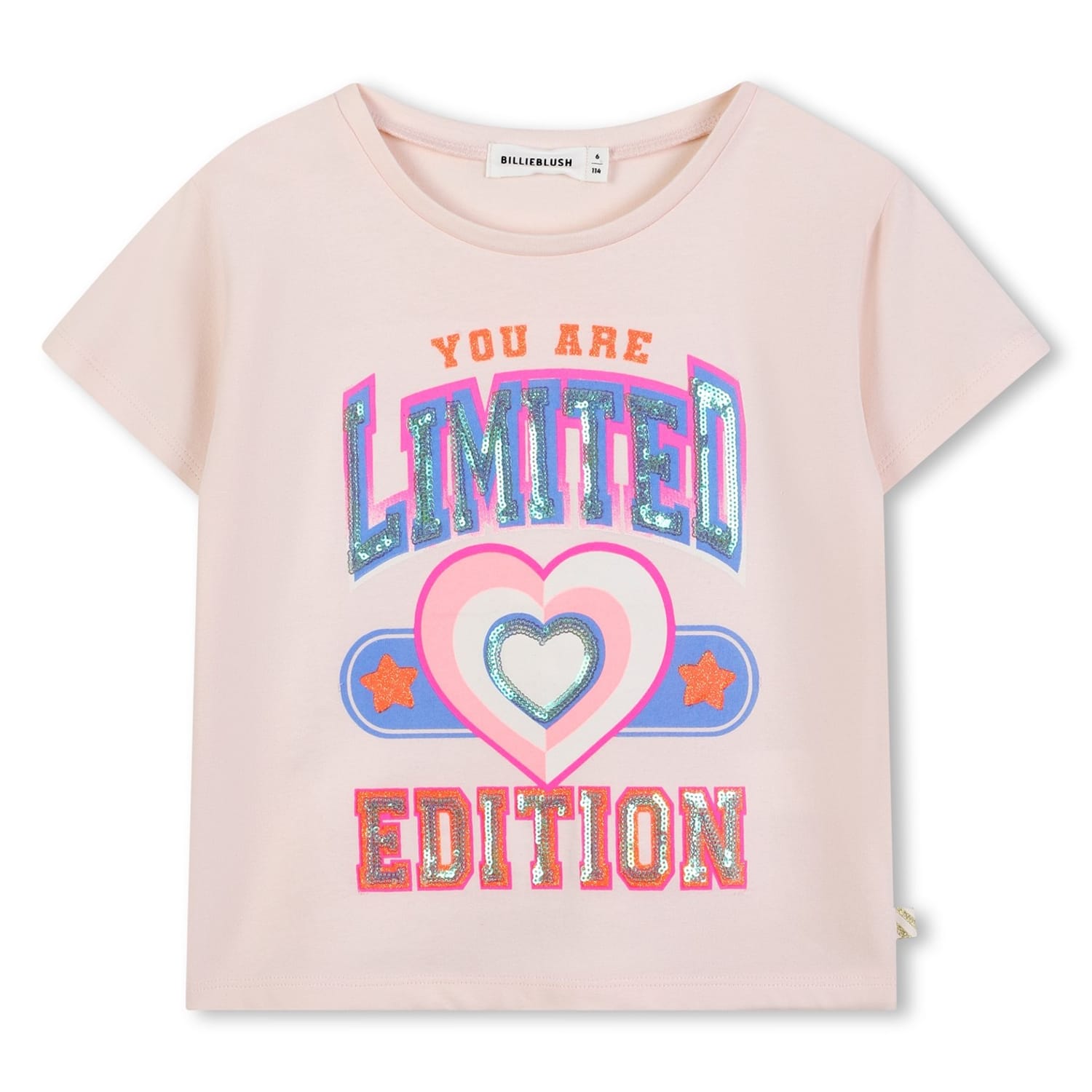 This Billieblush top features a regular fit with short sleeves and a crew neck. The design is enhanced with a graphic print and sequin embellishments, adding a touch of sparkle. The lettering graphic adds a playful element, making it a standout piece in any wardrobe. -
