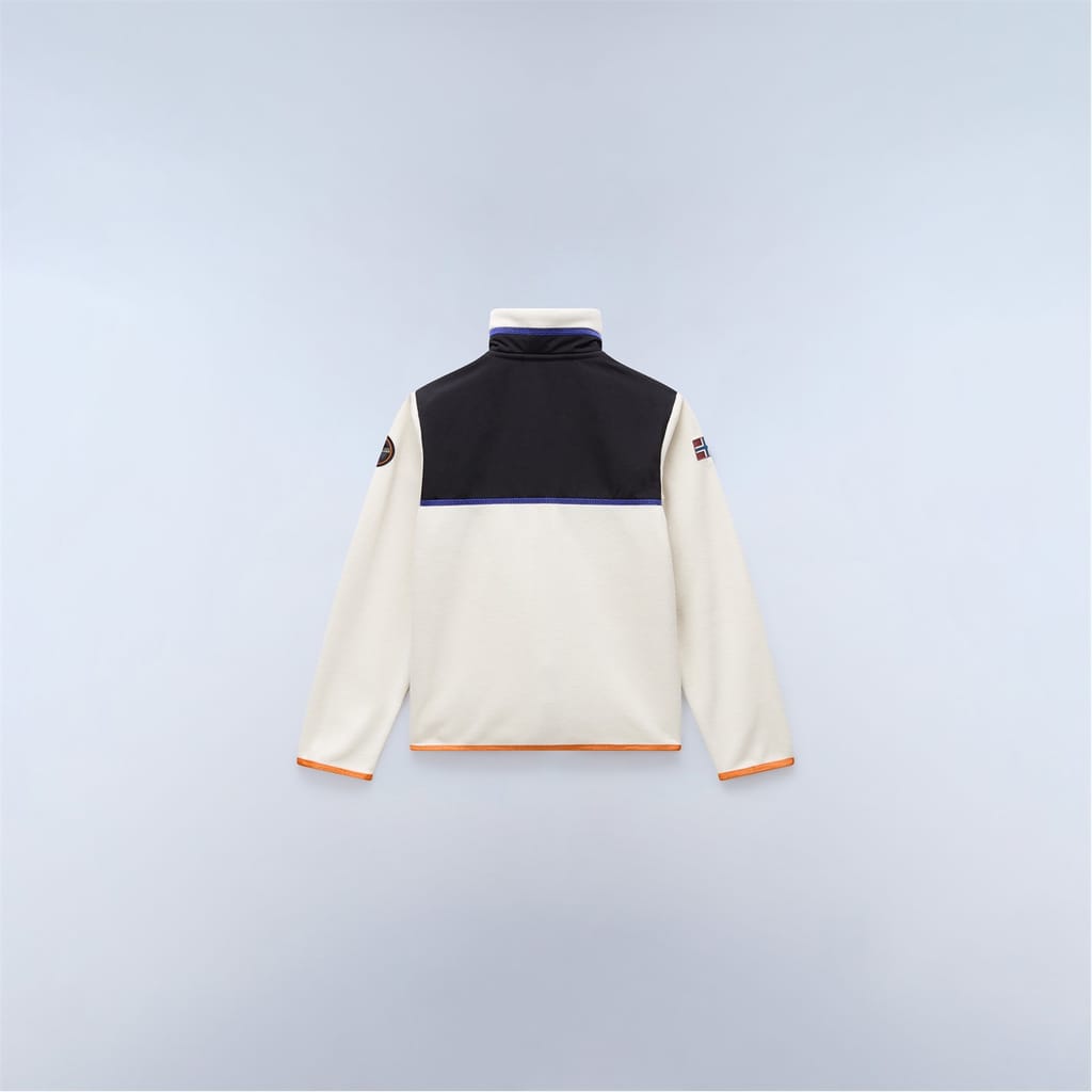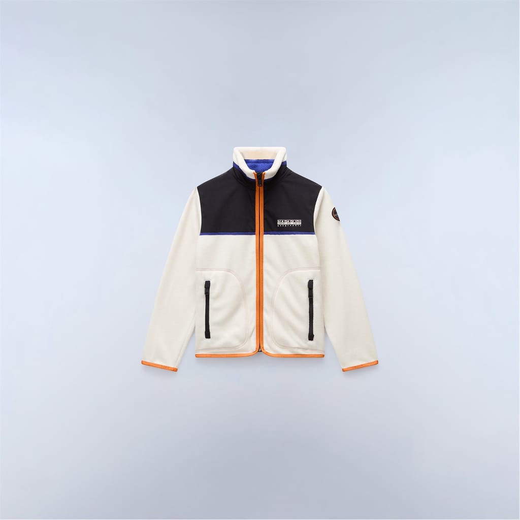 This Napapijri jacket for juniors features a full zipper closure and a regular fit. The short length and straight hem offer a modern silhouette, while the ribbed cuffs add a touch of comfort. The jacket is adorned with a logo and pockets, and its colour block pattern adds a stylish flair. -