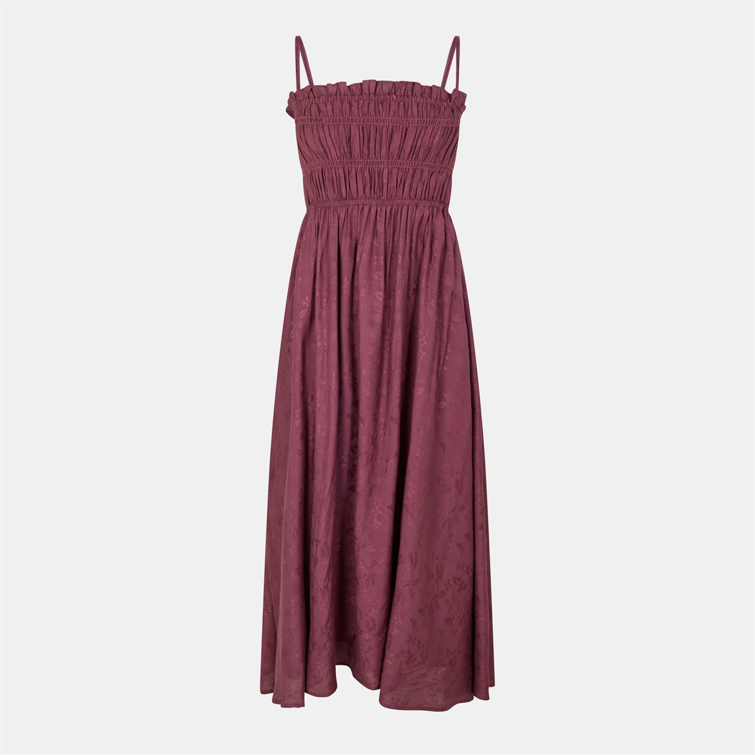 This Raffya maxi dress features a square neck and a straight hem, offering a classic A-line silhouette. The floral pattern and ruched embellishments add a touch of elegance, while the spaghetti straps provide a delicate finish. Perfect for those seeking a stylish and sophisticated look. -