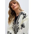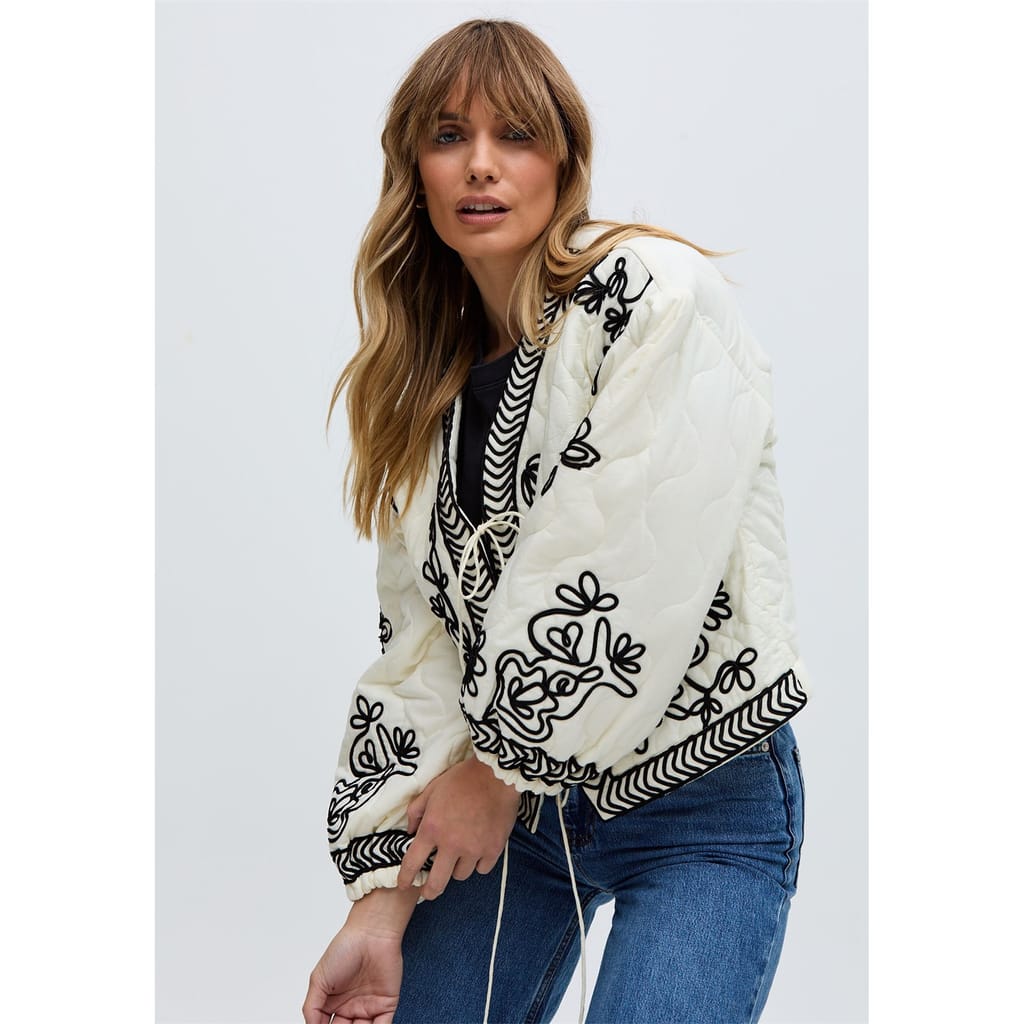 The Fran jacket is a sophisticated blend of comfort and artistry. Lightly padded for just the right amount of warmth, this jacket features intricate, all-over embroidery that adds a touch of elegance to its timeless design. The soft white hue evokes a sense of fresh, sun-kissed luxury, making it a perfect layering piece for cooler evenings or breezy mornings by the coast. -
