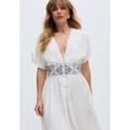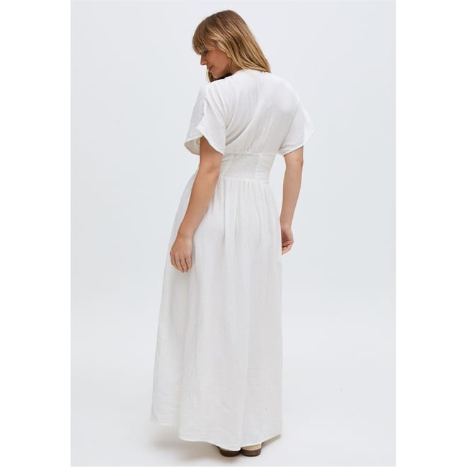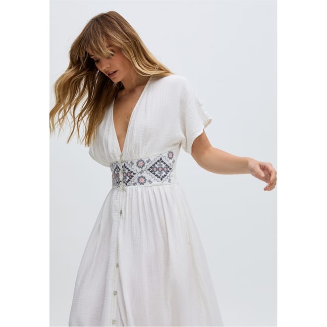 The Sally Ann maxi dress is the epitome of effortless elegance, blending timeless design with intricate detailing. The dress features delicate embroidery that adds texture and a touch of artisanal charm to the classic maxi silhouette.