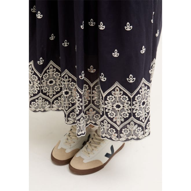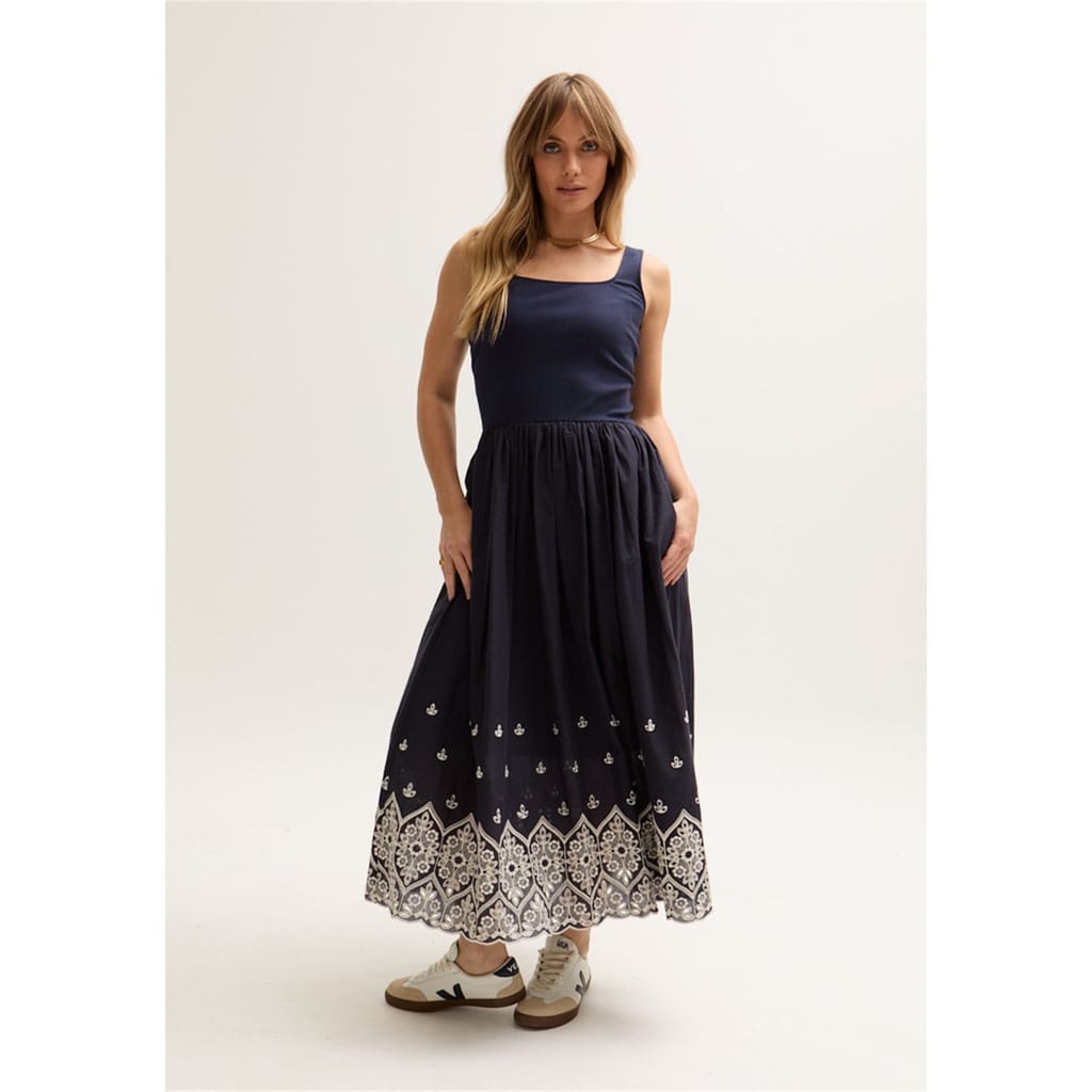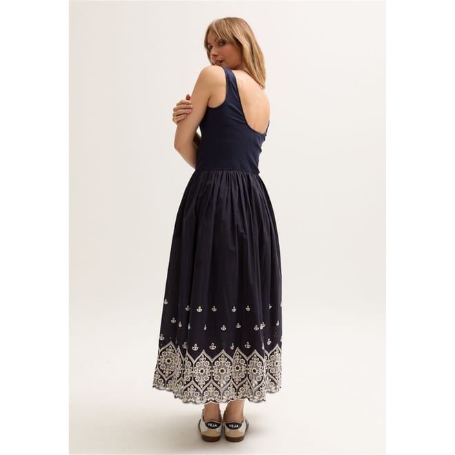 A masterful blend of modern sophistication and artisanal craftsmanship, the Cora midi dress offers a refined silhouette that effortlessly transitions from day to evening. The soft, form-fitting jersey bodice provides ultimate comfort, while the woven embroidery on the skirt adds a layer of intricate texture and visual interest.