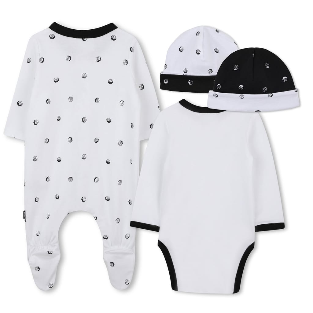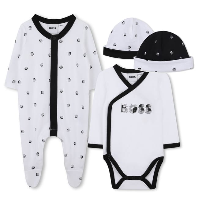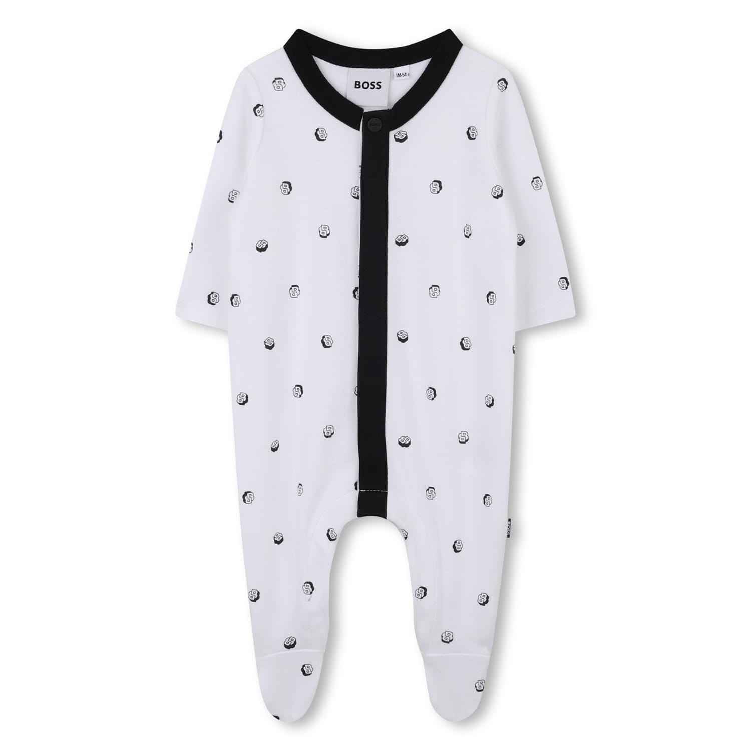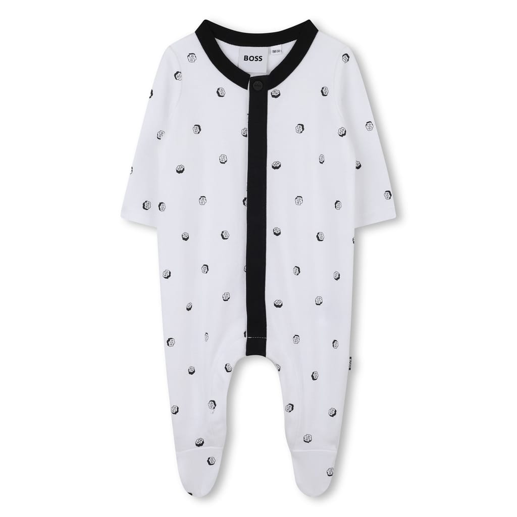 This Boss jumpsuit for babies and infants features a crew neck and long plain sleeves. The regular fit bodysuit is adorned with an all-over logo pattern and monogram embellishments, adding a touch of style. The embroidered details enhance its appeal, while the button closure ensures easy dressing. -