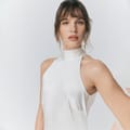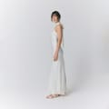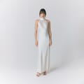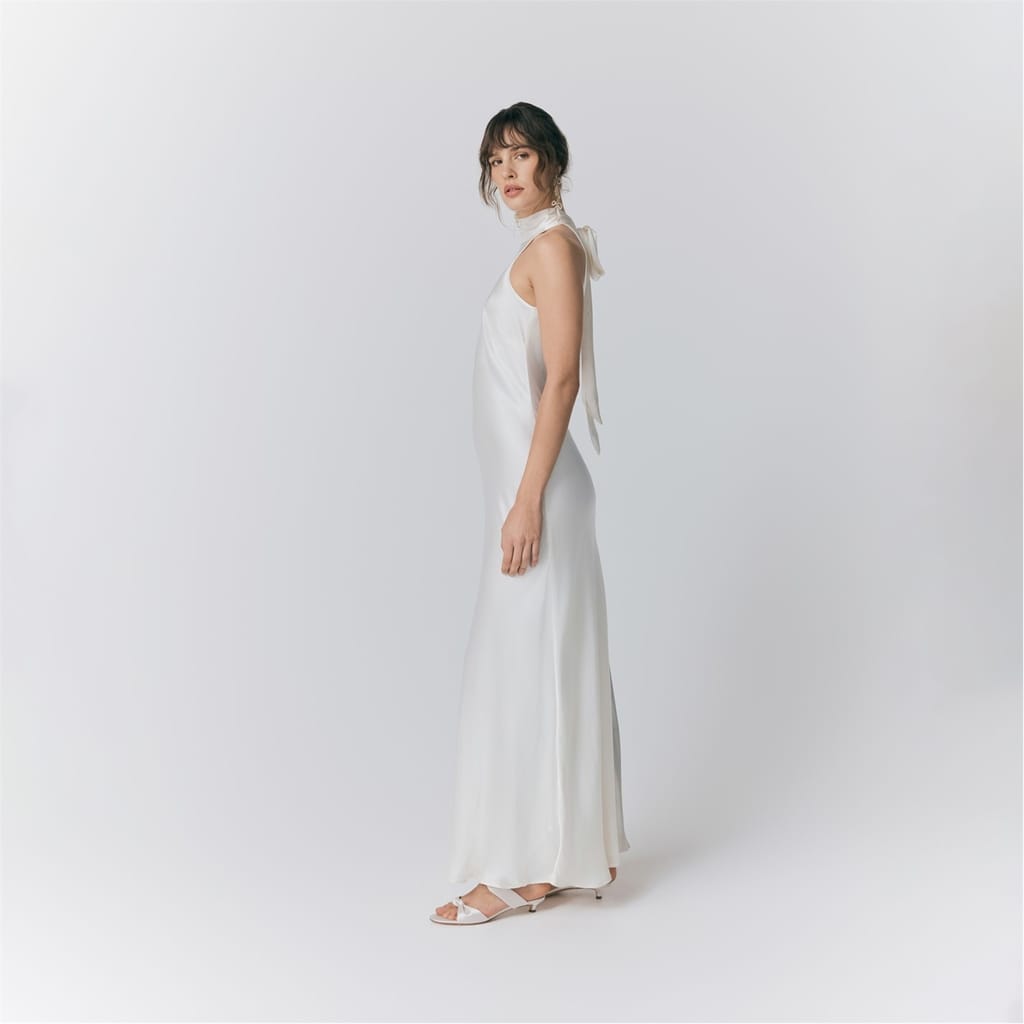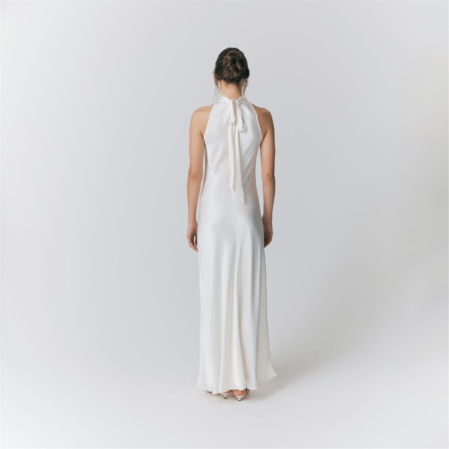 This Ghost maxi dress features a high collar and a halter neckline, offering a sophisticated look. The slim fit and solid pattern enhance its elegant appeal. With a tie-back closure and a straight hem, this slip-style dress is perfect for any occasion. -