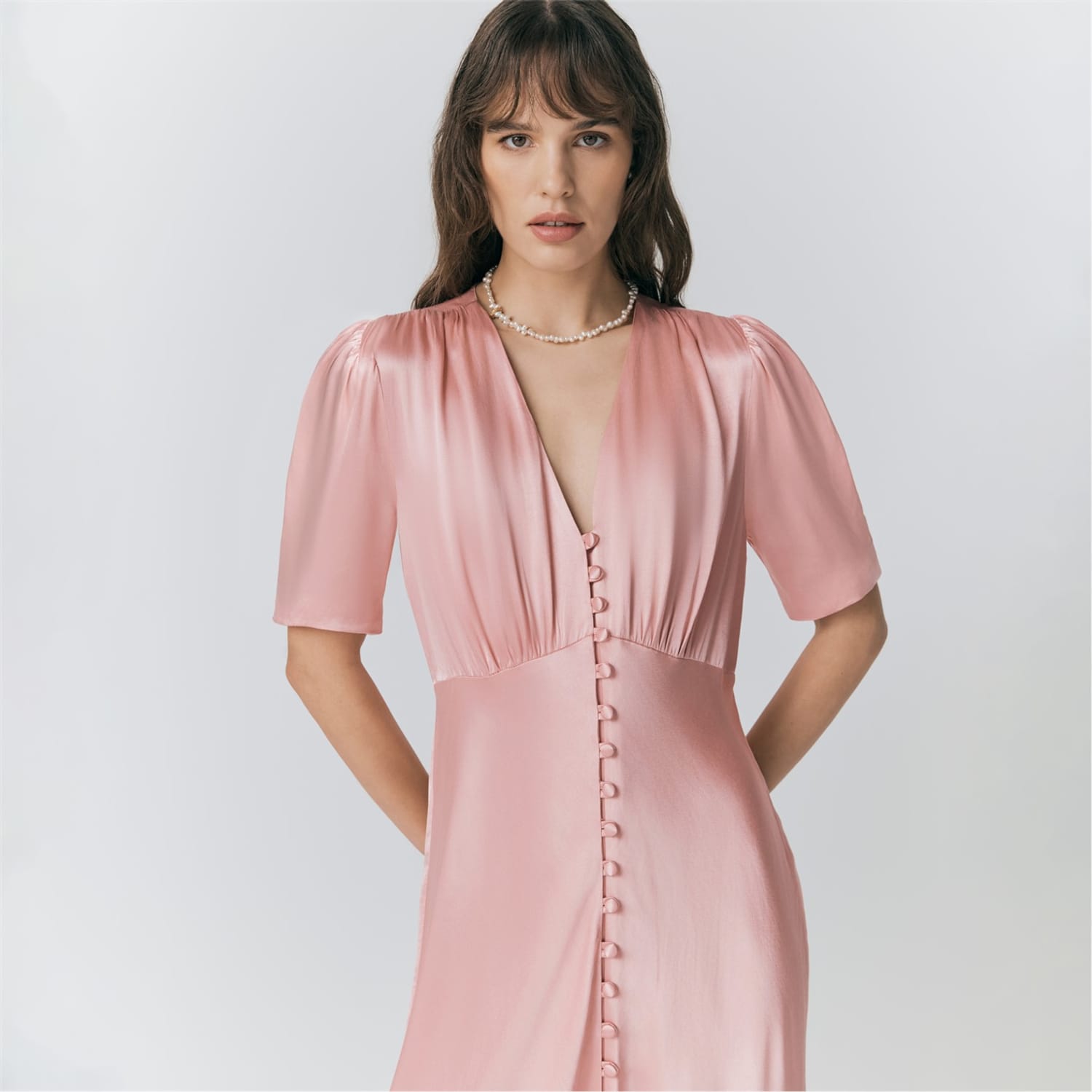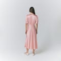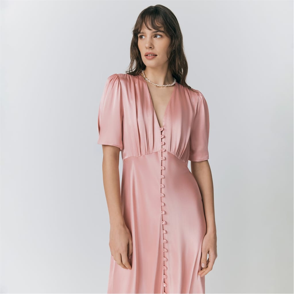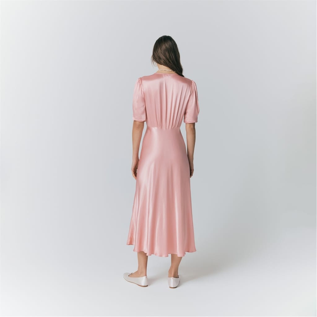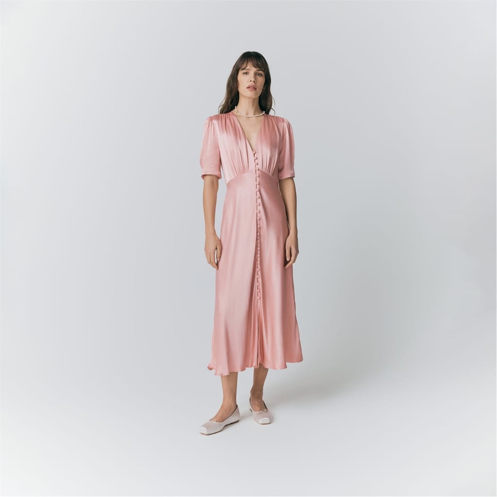 This Ghost midi dress features a sophisticated V-neck and three-quarter puff sleeves, offering a timeless silhouette. The solid pattern enhances its elegant appeal, while the button closure adds a classic touch. Designed in a regular fit, this dress is perfect for various occasions, combining style and comfort effortlessly. -