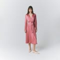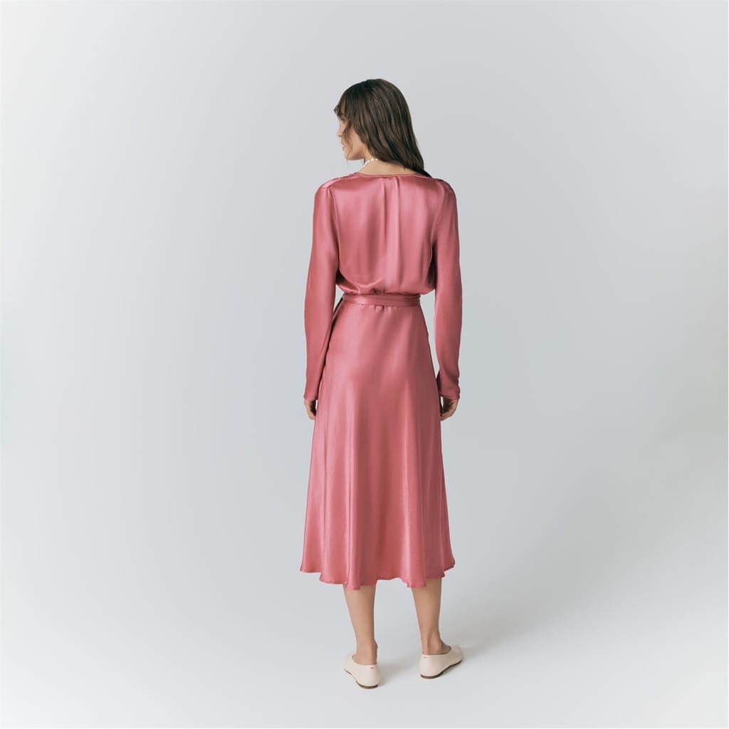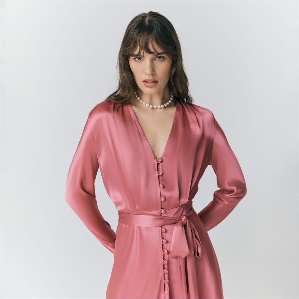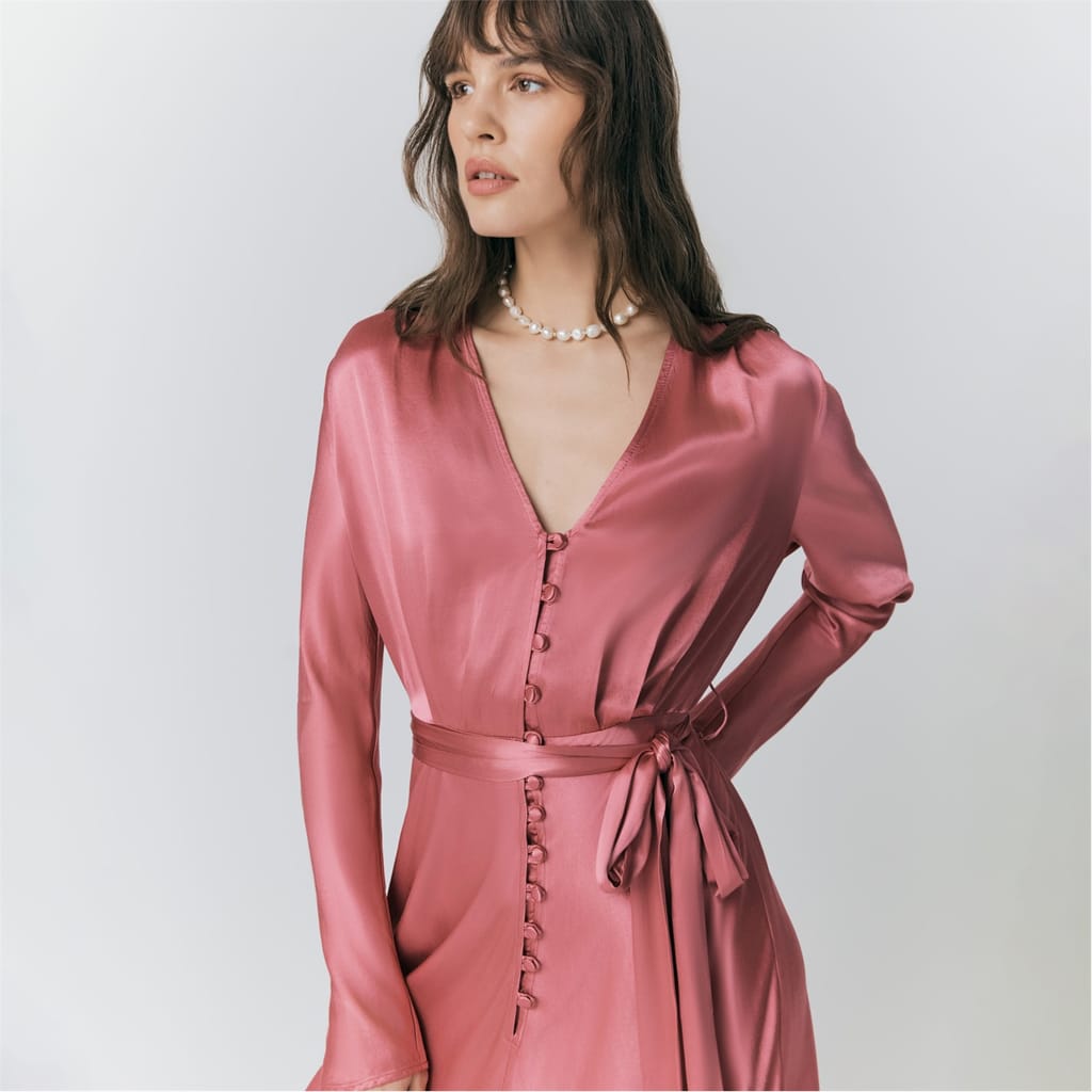 This Ghost midi dress features a classic A-line style with a V-neck and long sleeves. The solid pattern and curved hem add a touch of elegance, while the button closure ensures a secure fit. Perfect for any occasion, this dress combines timeless design with modern sophistication. -