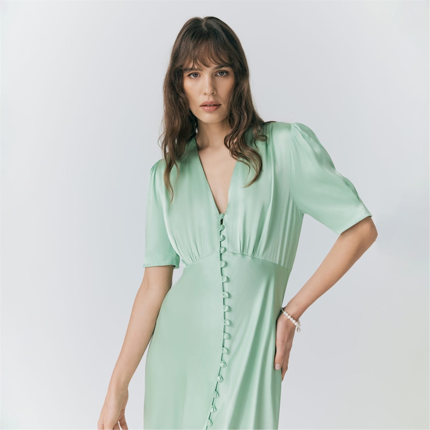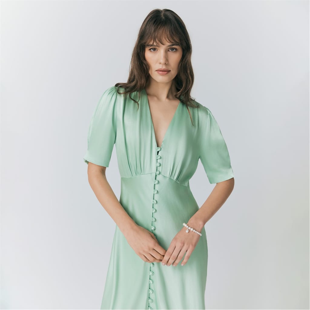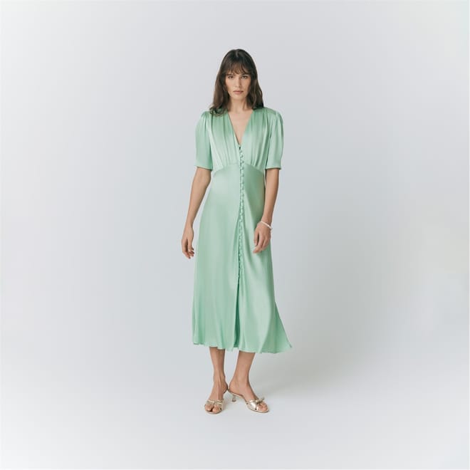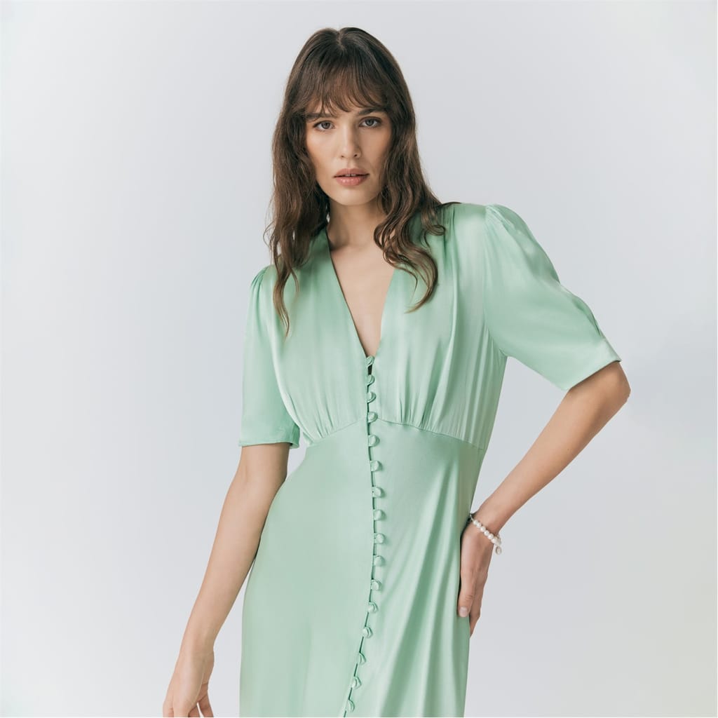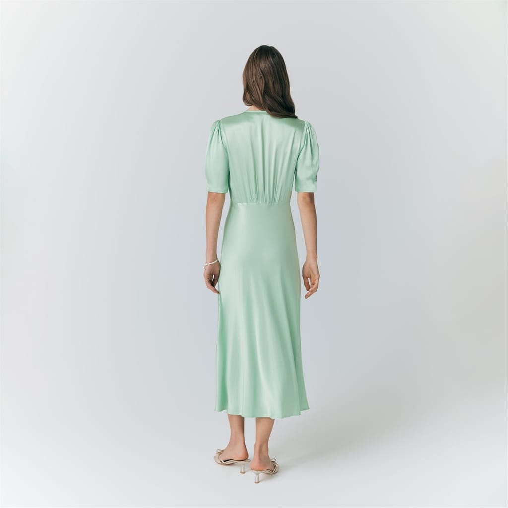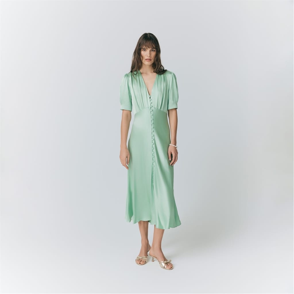 This Ghost midi dress features a solid pattern with a flattering V-neck and short puff sleeves. The regular fit ensures comfort, while the button closure adds a classic touch. Perfect for any occasion, this dress combines elegance with simplicity. -