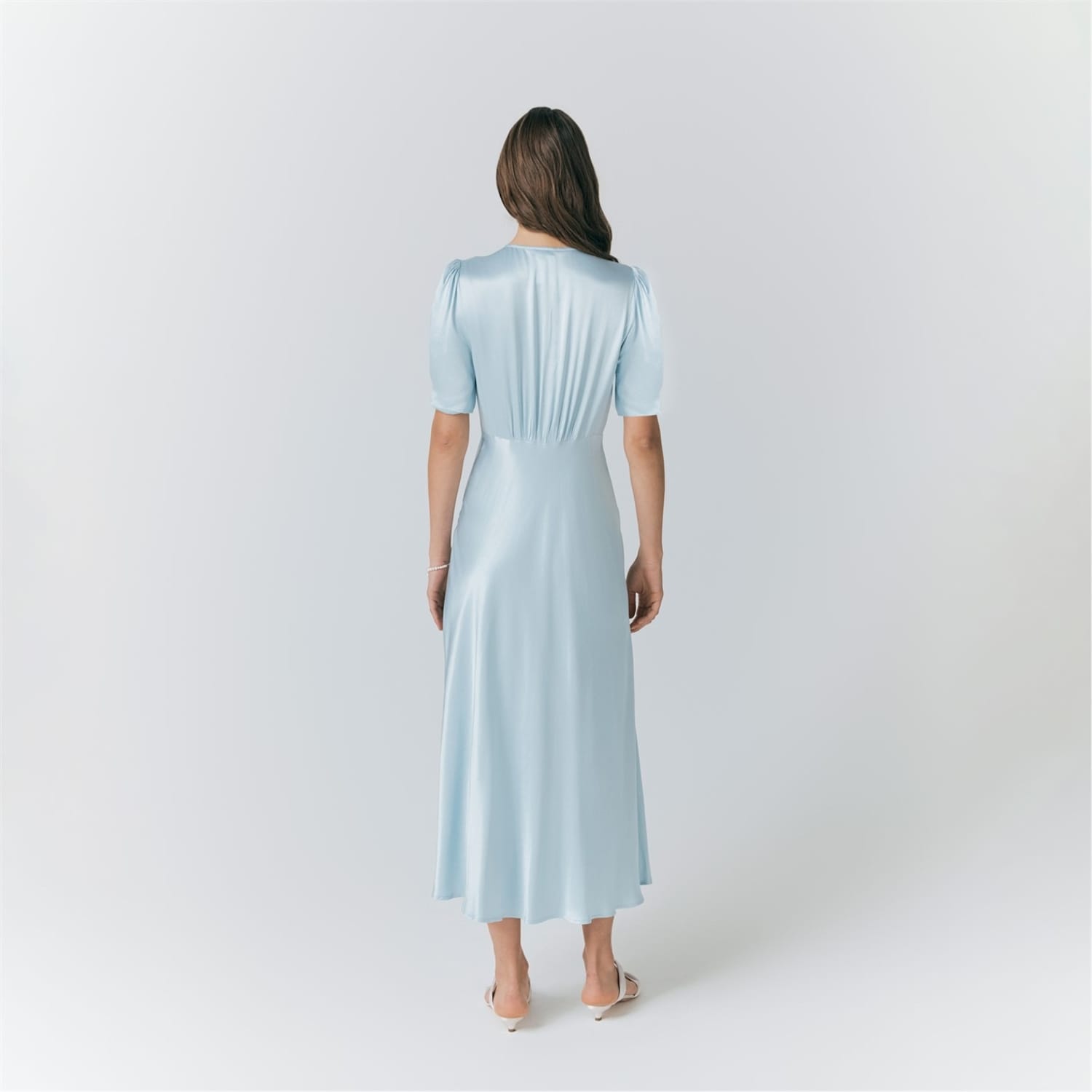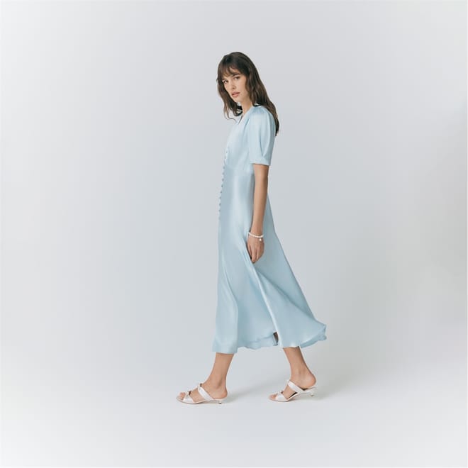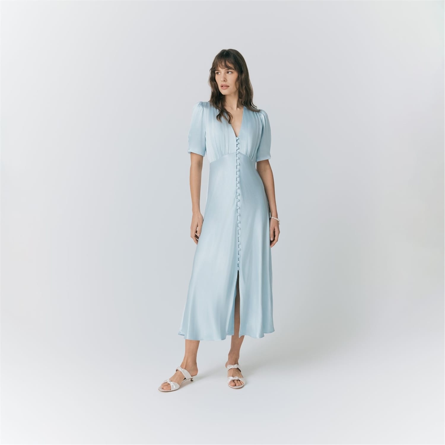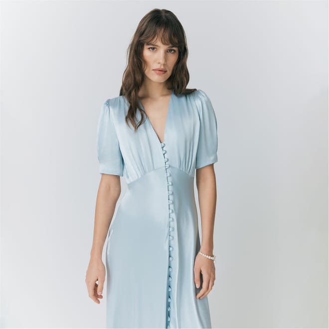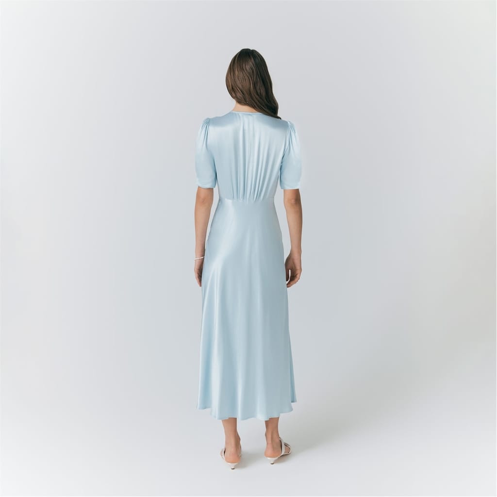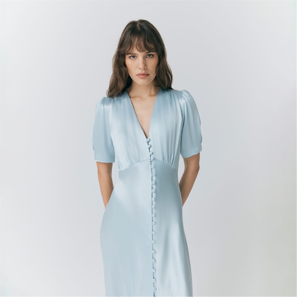 This Ghost midi dress features a solid pattern with a v-neckline and puff sleeves, offering a stylish slip design. The slim fit enhances the silhouette, while the button closure adds a touch of elegance. -