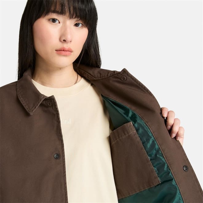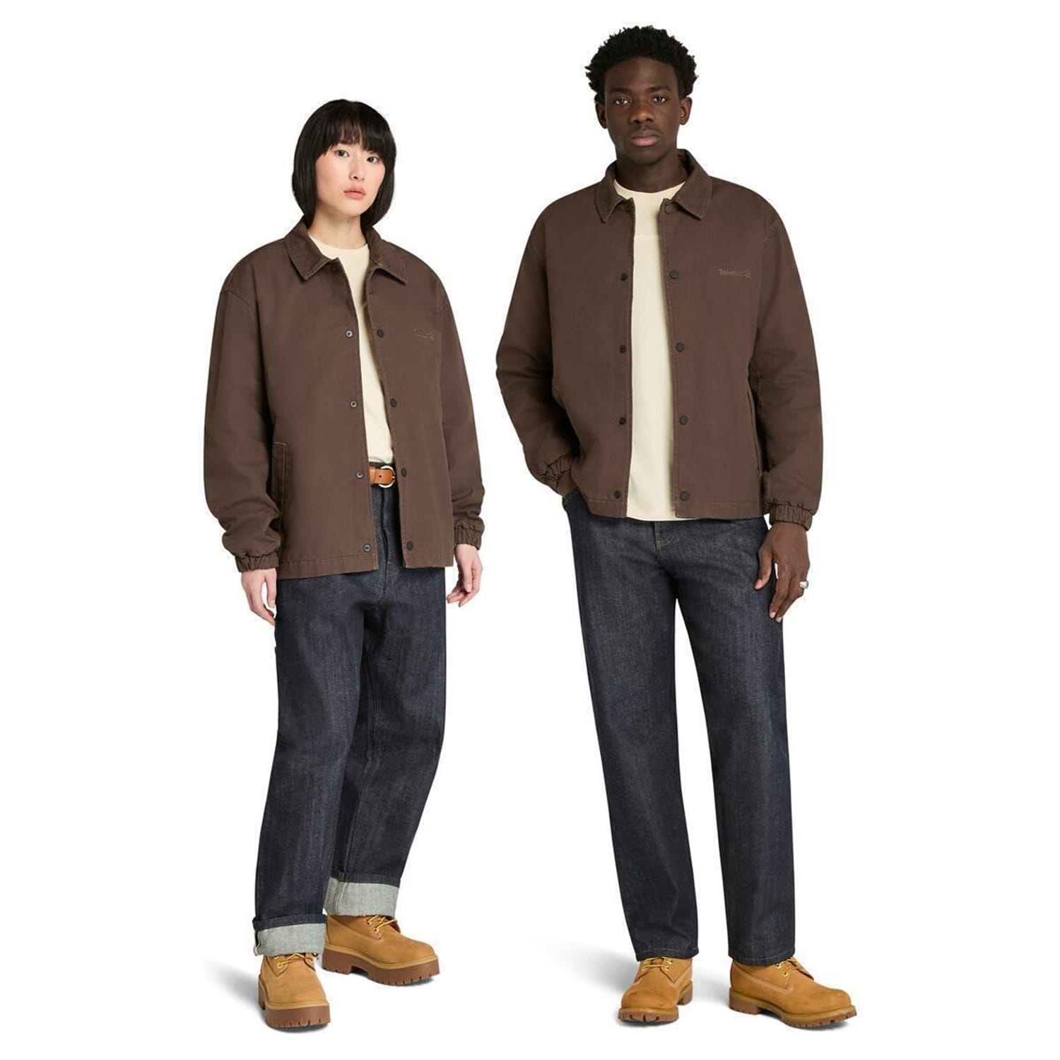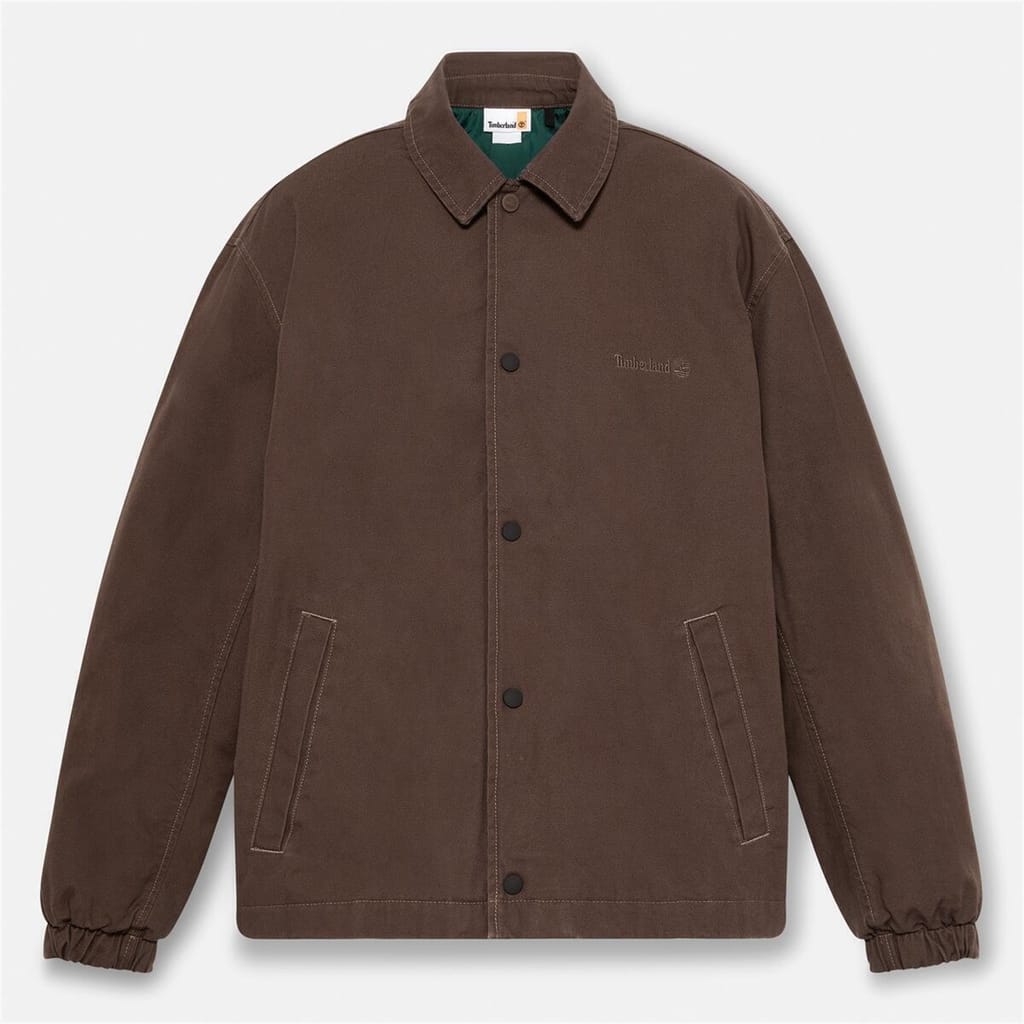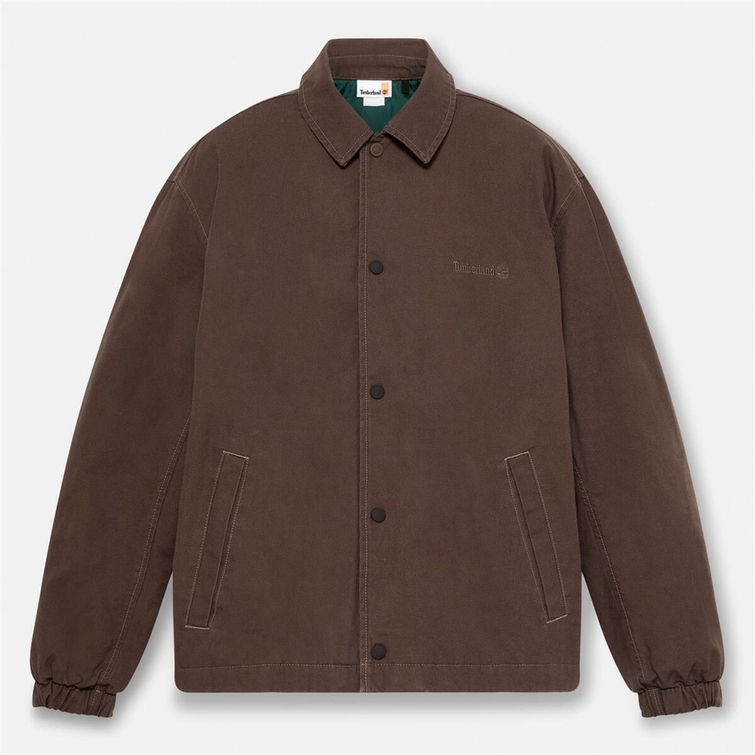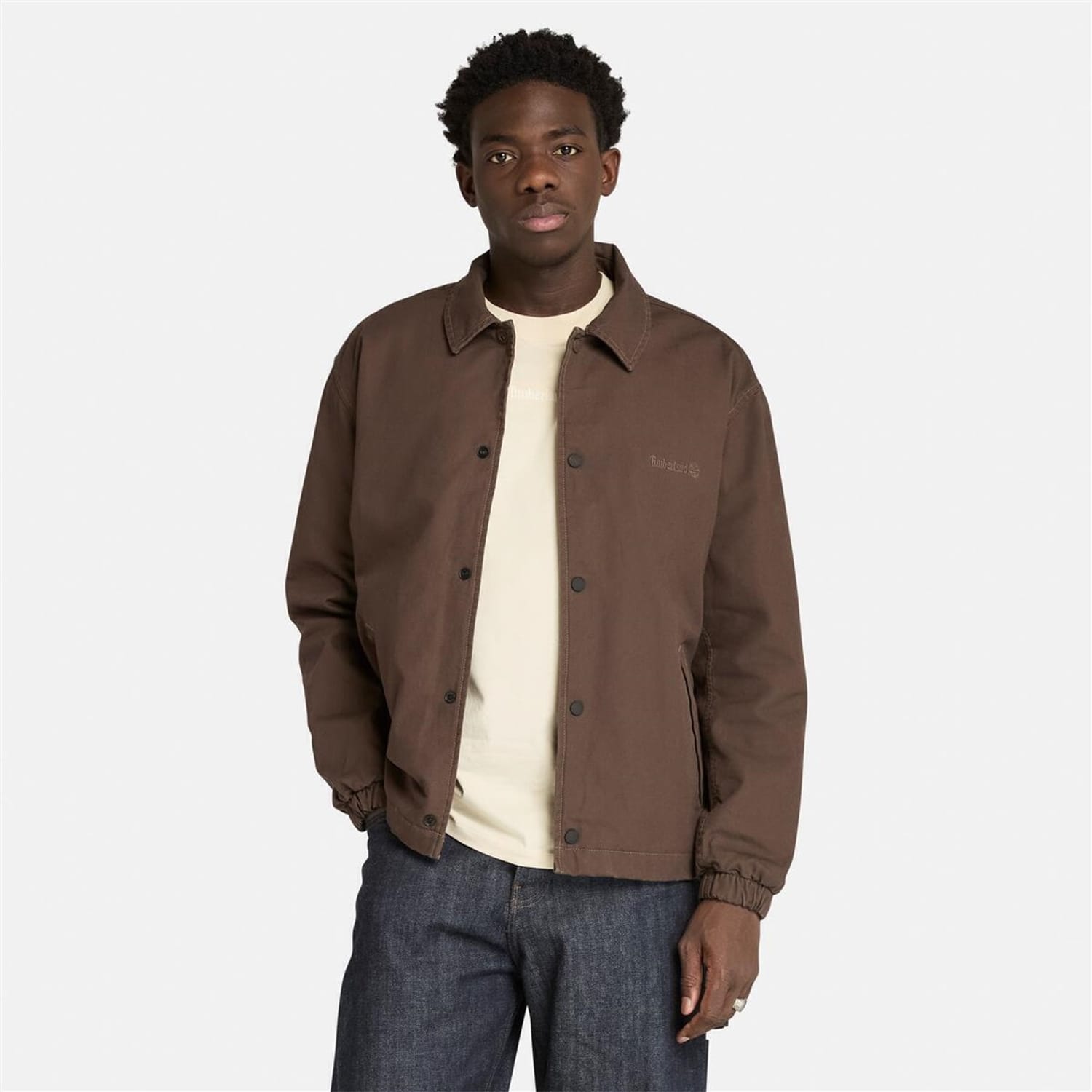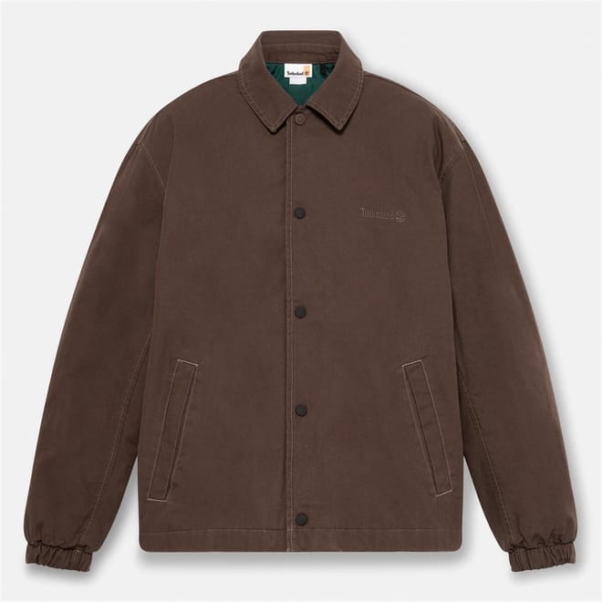 The Timberland coach jacket is a versatile piece featuring a point collar and a snap button closure. Designed in a regular fit, this short jacket includes elasticated cuffs and a straight hem. The solid pattern is complemented by practical details such as slant pockets, an inner pocket, and an embroidered logo, making it a functional addition to your wardrobe. -