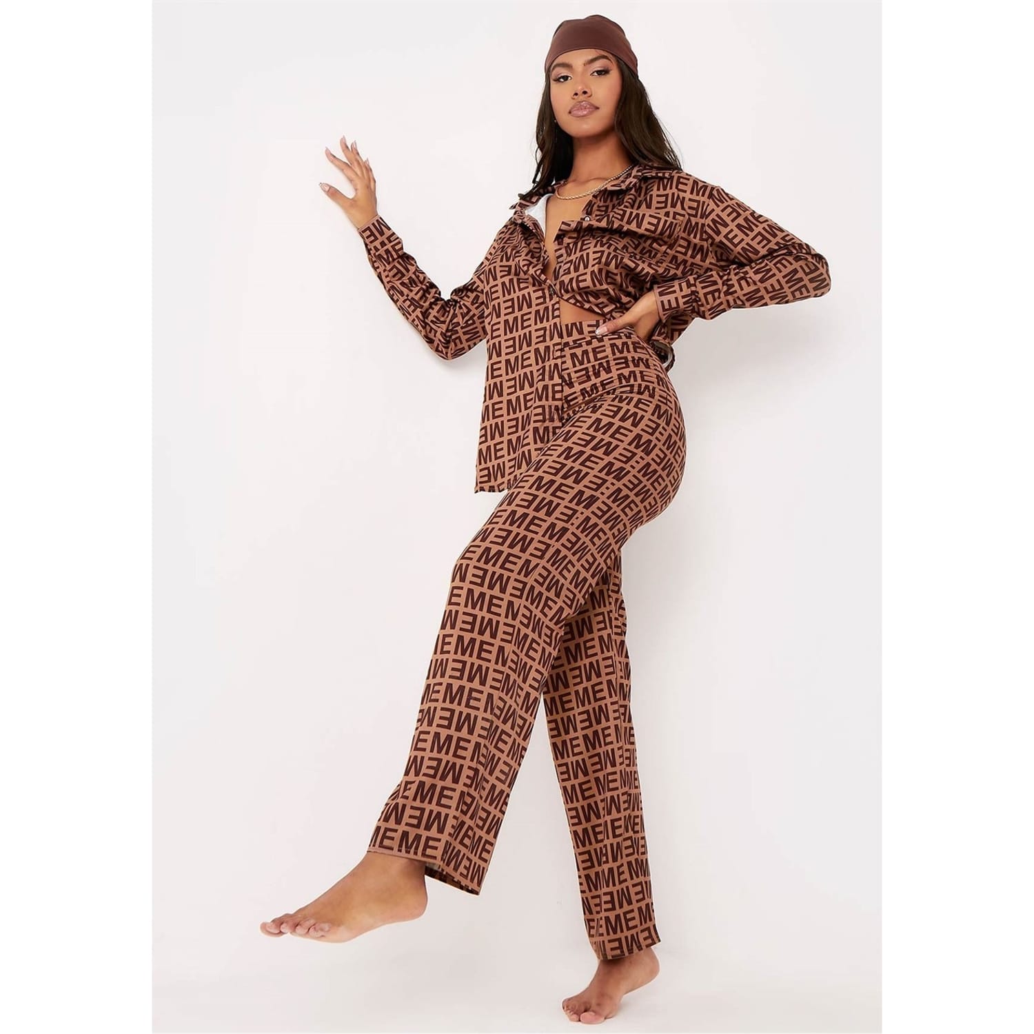 Make a bold statement with our ME Print Straight Leg Trousers! These daring pants are designed to turn heads. With their eye-catching ME print and flattering straight leg silhouette, they're perfect for the fashion-forward trendsetter. Dare to pair them with a crop top and heels for a look that screams fearless confidence! -