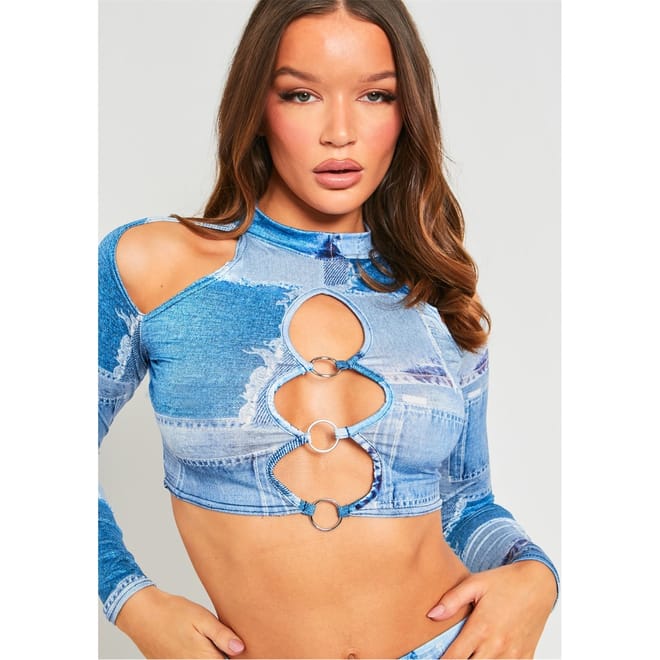 Our Print Cut Out O Ring Long Sleeve Crop Top features a print all over, a cut out O ring detail and cold shoulder. Style with a skirt for a 2000's look. -