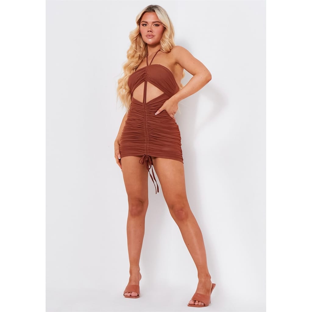 We're looking sexy af in this amazing bodycon mini dress. Our Halterneck Ruched Mesh Dress features a halterneck, finished in a mini dress style. -