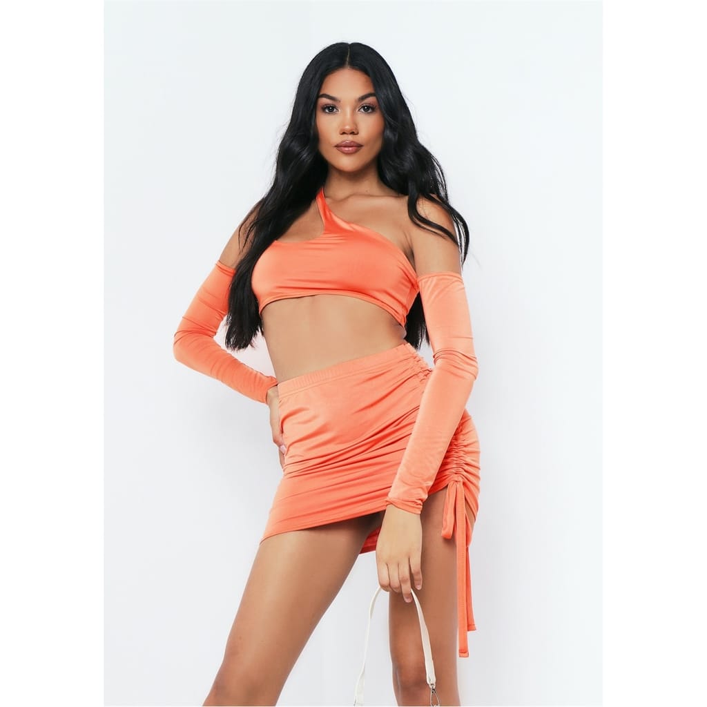 Orange you glad you stumbled across this one, babe? One Shoulder Sleeves Crop Top features double strap on one shoulder, cold shoulder style, cropped length, made in an orange material. Co-ord with our matching mini skirt for a look we are loving!! -