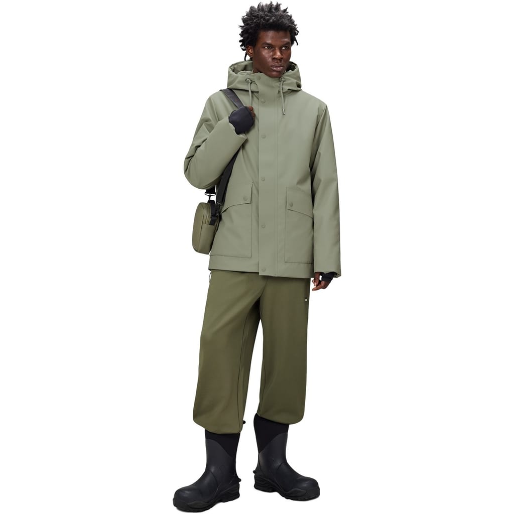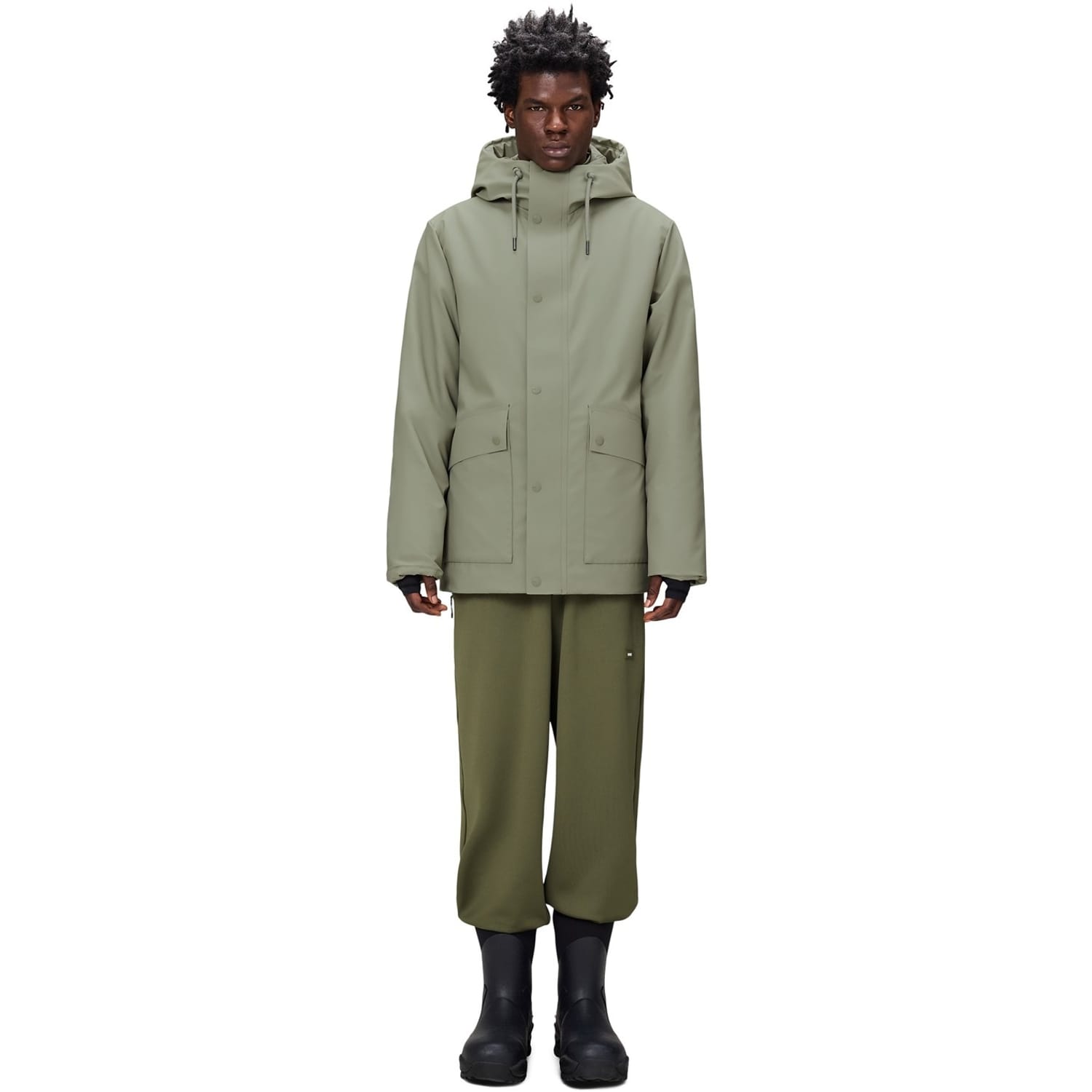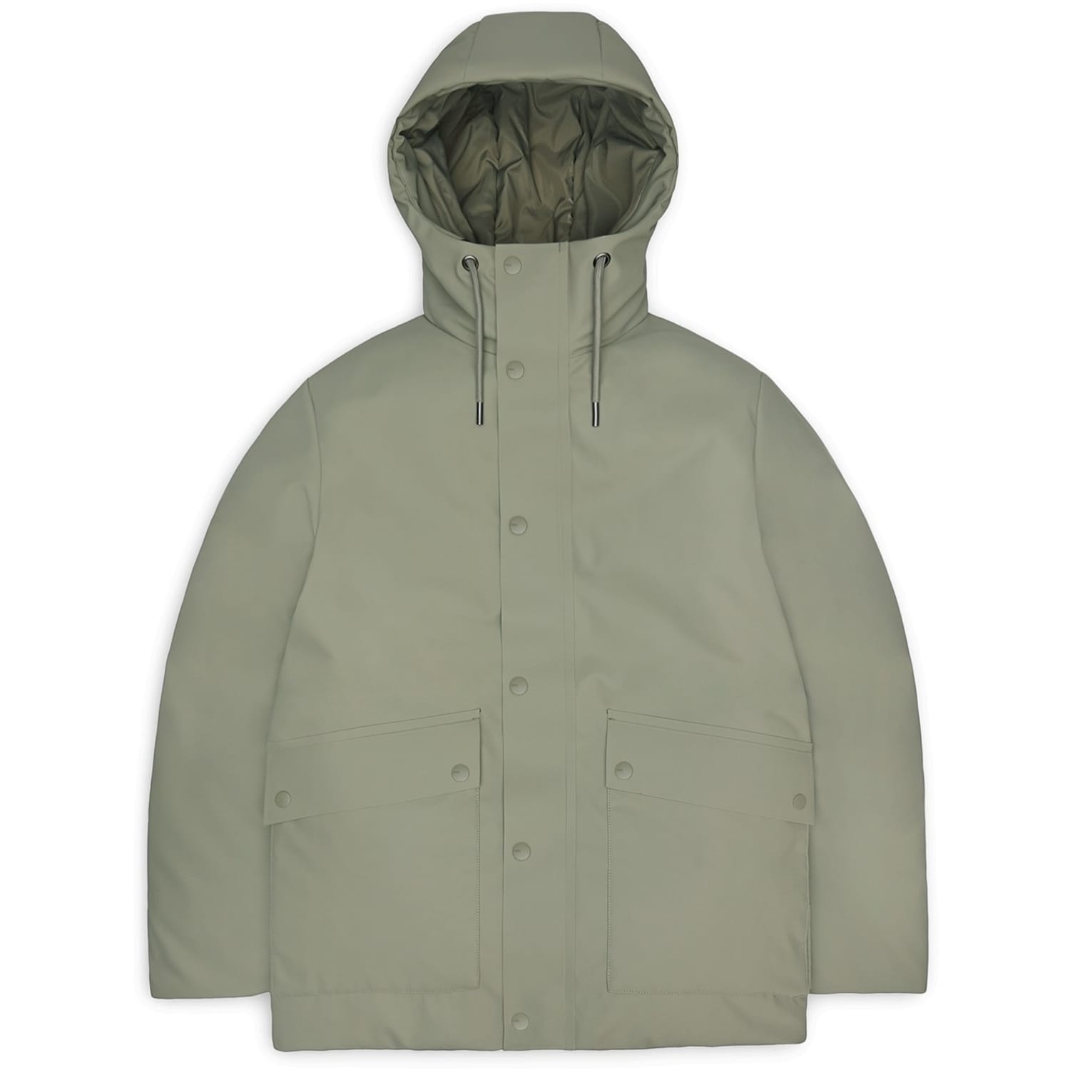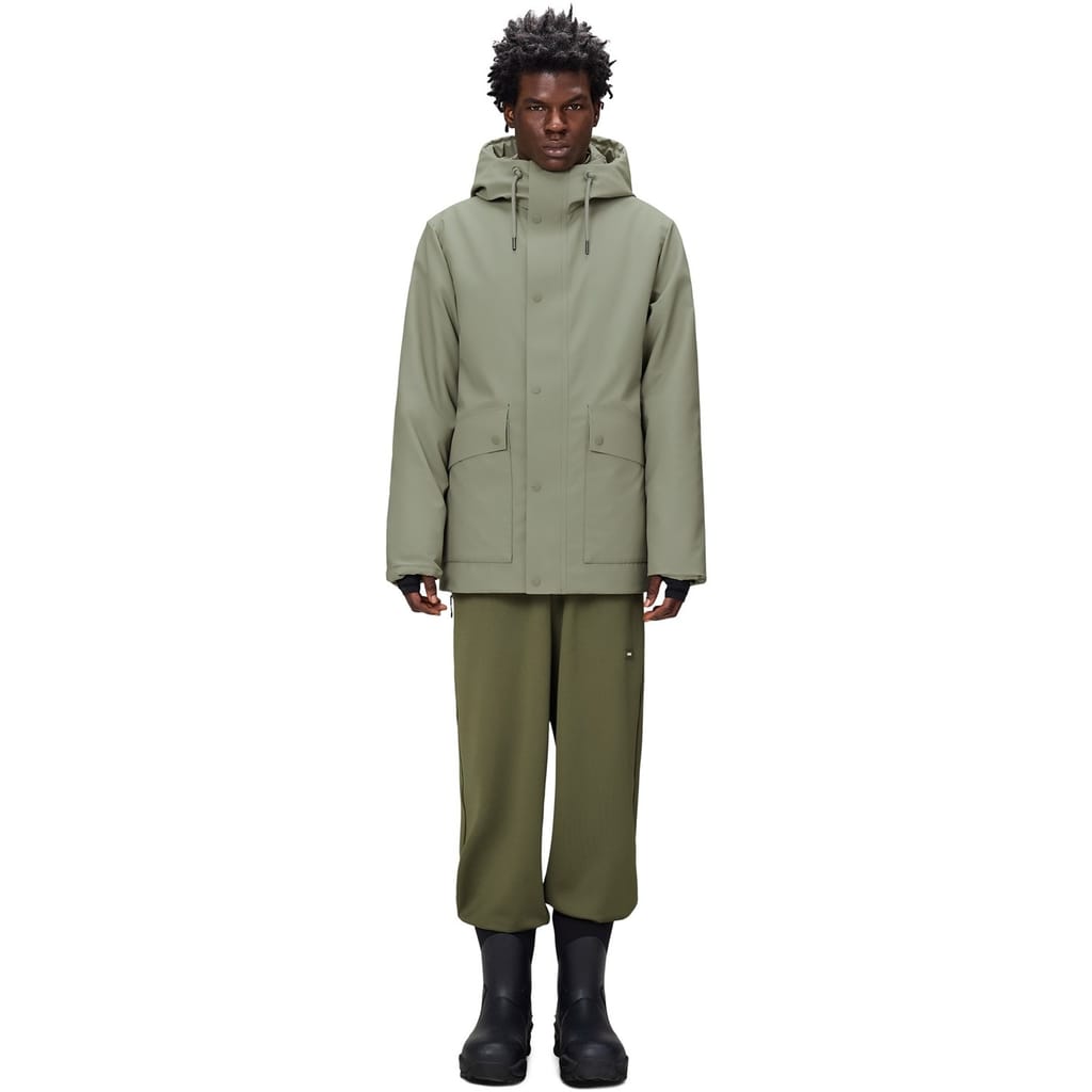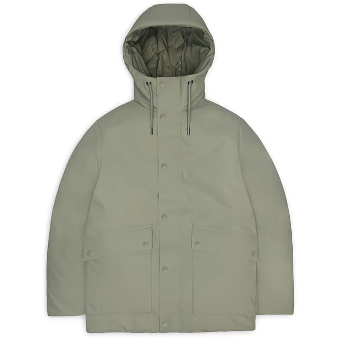 The Rains parka is designed for winter, offering a relaxed fit with a solid pattern. It features a hooded neckline and a snap button closure, ensuring practicality and style. The straight hem and pockets add functionality, making it suitable for both sport and casual collections. -
