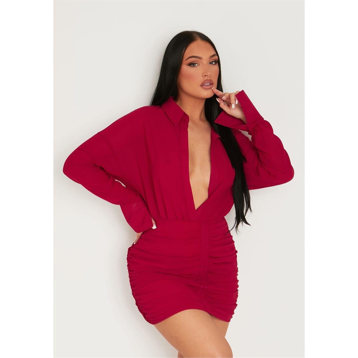 Occasion-where? Our Long Sleeve Plunge Front Ruched Skirt Mini Dress features a plunge neckline, ruched skirt detailing and finished in a mini dress length. Pair with some black heels and a mini bag to finish the look. -