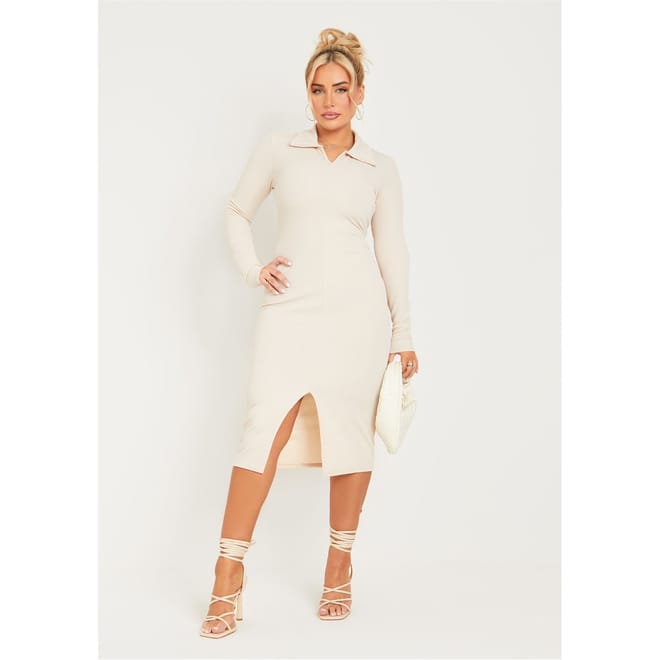 Sophisticated and sexy in our Crinkle Rib Long Sleeve Collared Midi Dress, featuring a crinkle rib material and collar detail in a bodycon fit. Grab your heels babe! -