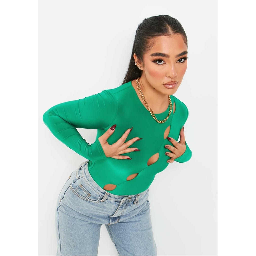 Inject a pop of colour with our Olivia Green Double Layer Slinky Cut Out Long Sleeve Bodysuit, featuring a slinky material and cut out detail. Style with some leather pants and dress it up. -