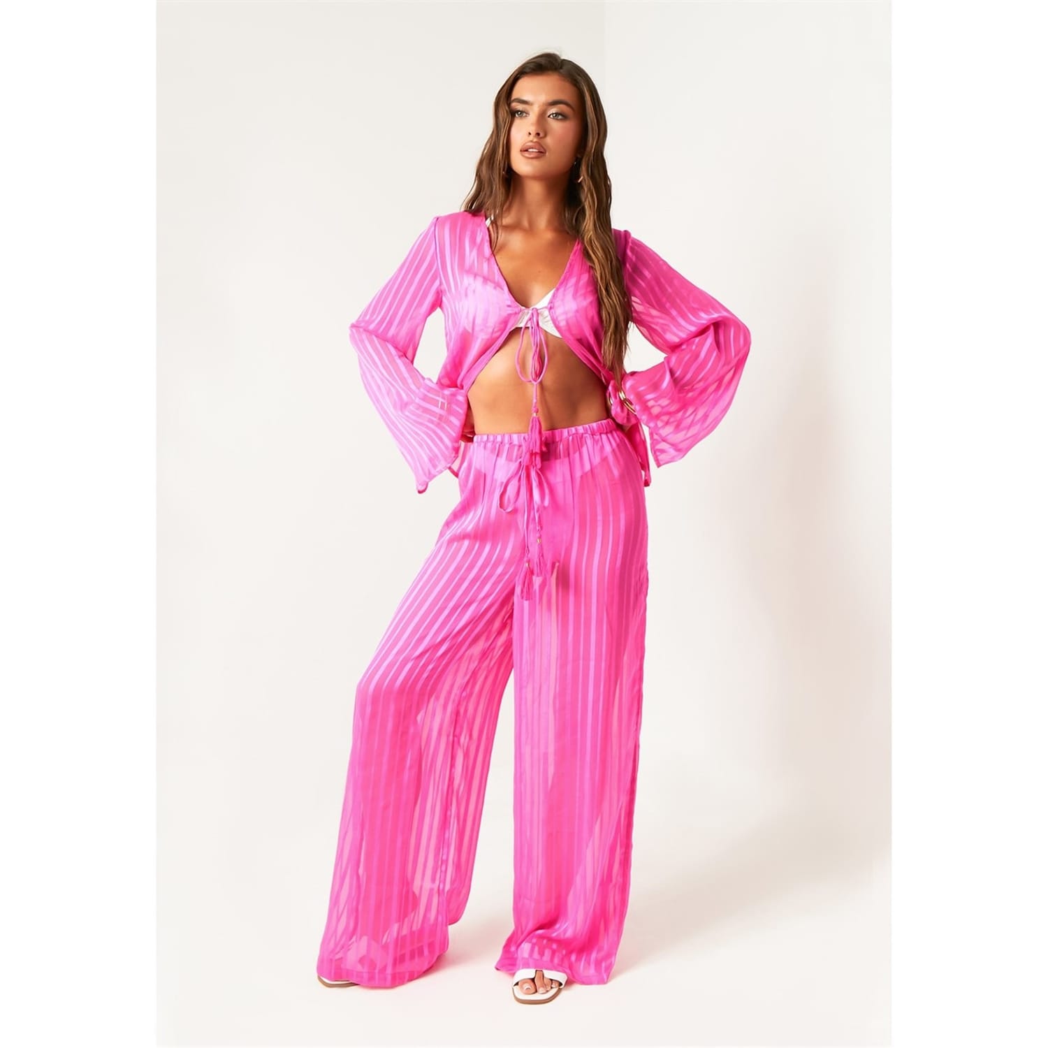 Embrace effortless beach chic with the Sheer Stripe Beach Cover Up Trouser. These airy trousers feature delicate sheer stripes, offering a stylish yet lightweight layer over your swimsuit. Perfect for poolside lounging or seaside strolls, they blend comfort with an elegant touch. -