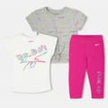 This Reebok coord set features a graphic print t-shirt with a crew neck and plain short sleeves, paired with comfortable leggings. The set is adorned with a logo embellishment, adding a touch of brand identity. Ideal for those who appreciate style and comfort in their wardrobe essentials. -