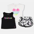 This Reebok top short set is perfect for training sessions. The set includes a sleeveless tank with a crew neck, featuring a tie-dye pattern and embellished with a heart and lettering graphic. The athletic shorts complement the top, making it an ideal choice for activewear. The iconic Reebok logo adds a touch of brand authenticity to this stylish ensemble. -
