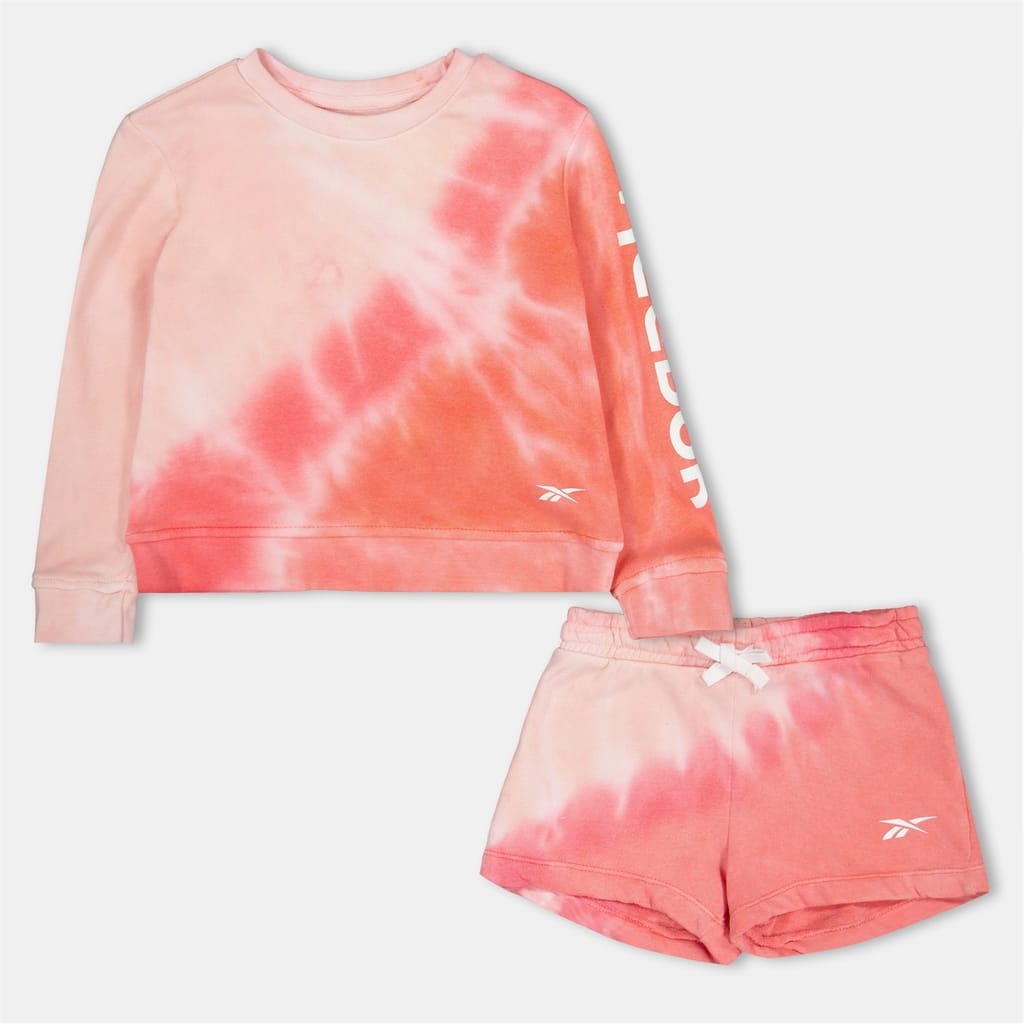 This Reebok top short set features a tie-dye pattern, perfect for a relaxed look. The sweatshirt comes with a crew neck and plain long sleeves, offering comfort and style. Paired with casual shorts, this set is ideal for laid-back days. The Reebok logo adds a touch of brand identity, making it a stylish choice for any casual occasion. -