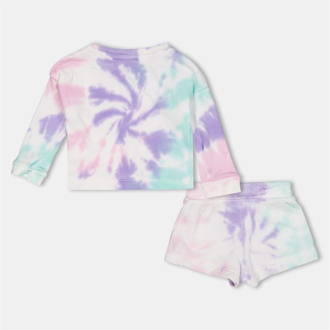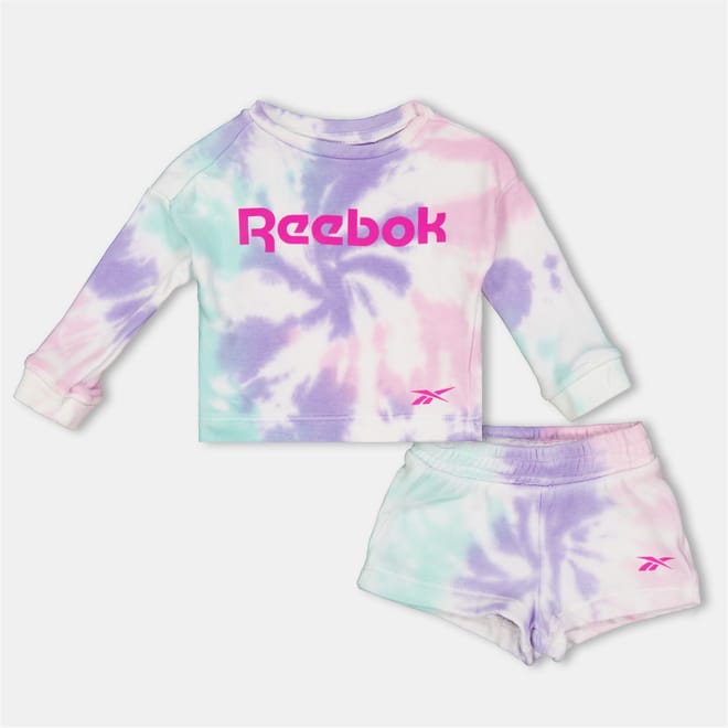 This Reebok top short set features a tie-dye pattern, perfect for a casual look. The set includes a sweatshirt with a crew neck and plain long sleeves, complemented by casual shorts. The sweatshirt is adorned with a logo, adding a touch of brand identity. Ideal for those seeking comfort and style in their casual collection. -