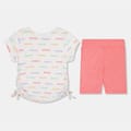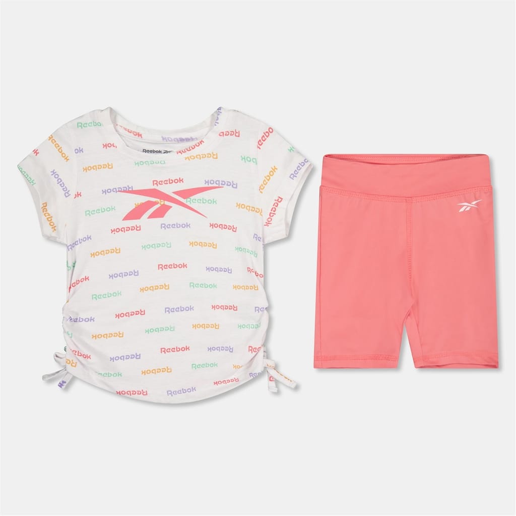 This Reebok top short set is perfect for biking enthusiasts. The set includes a t-shirt with a crew neck and plain short sleeves, featuring an all-over logo pattern. Paired with athletic shorts, this ensemble combines style and functionality. The logo embellishment adds a distinctive touch, making it a standout choice for active wear. -