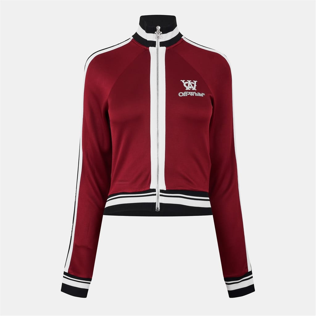 This Off-White track jacket features a zip neck and a zipper closure, offering a regular fit. The short length and raglan sleeves provide a comfortable and stylish look. Embellished with the brand's logo, this solid pattern jacket is a versatile addition to your wardrobe. -