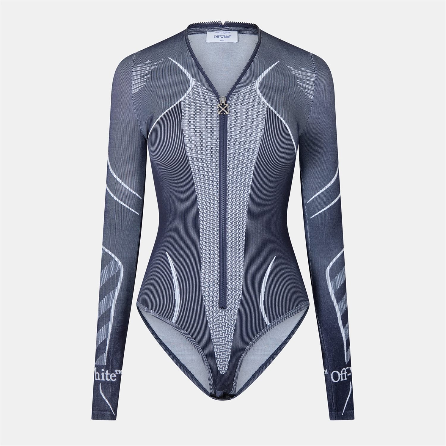 This Off White top from the racing collection features a zip neck and long sleeves, offering a snug fit. The graphic print adds a distinctive touch, while the zipper closure ensures ease of wear. Ideal for those seeking a stylish yet functional piece. -